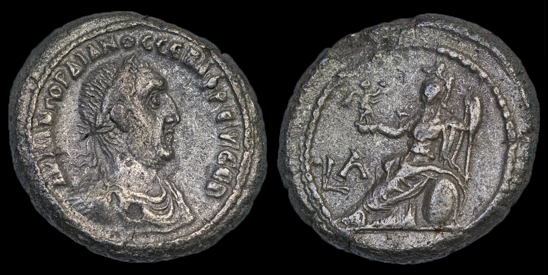 Wonderful obverse; reverse??? Alexandrian years began at the end of August (30th or 29th in leap years). Gordian became emperor in July 238 so year one Augustus coins only cover two months and are all rare. Caesar coins are more common. Year six would start at the end of August 242 and end the end of August 243 when year 7 began. Gordian died in February 244 so year 7 was only a half year. The obverse legend changed with year 5 so your coin could be confirmed without a reverse photo to that late period. Mine is a year 7 Emmett 3402. Year 6 eagles seem to be left facing with wreath in beak (correct?) and Emmett 3401. I don't have a year 6 eagle but this is year 6 Tyche. To my eyes, he aged a lot in that last year.