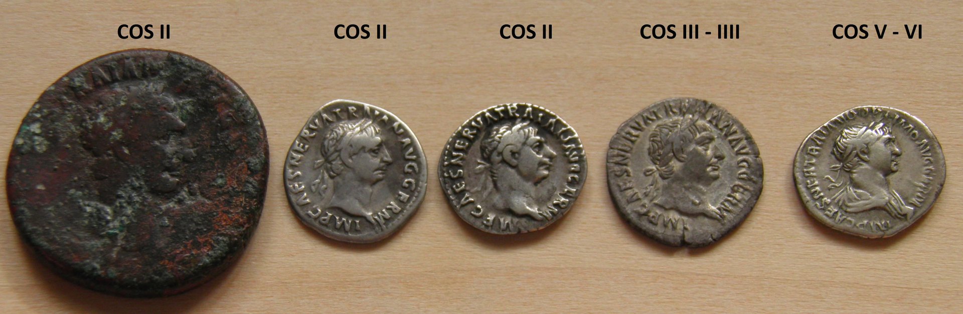 The sequence of Trajan's portraits below represent the transition from his ''Nerva look'' portrait early COS II to the classical portrait used after the Dacian wars COS V - VI.