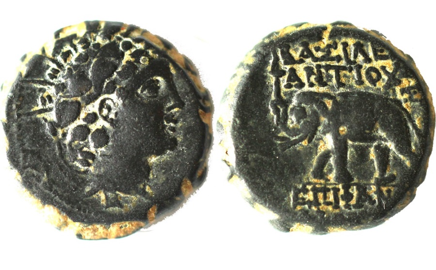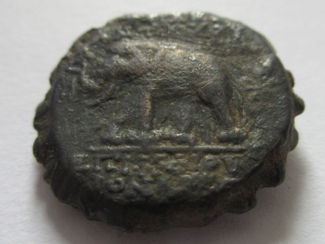 We're doing Sele elephants now? Antiocus VI, ca. 148–142/1 BC Minted in Antioch - for some reason I didn't weigh and measure this coin. Obv.: Radiate head of Antiochus VI, wreathed with ivy. Rev.: ΒΑΣΙΛΕΩΣ ΑΝΤΙΟΧΟΥ / ΕΠΙΦΑΝΟΥΣ ∆ΙΟΝΥΣΟΥ; elephant walking left holding torch in trunk, ΣΤΑ above right, cornucopia right.
