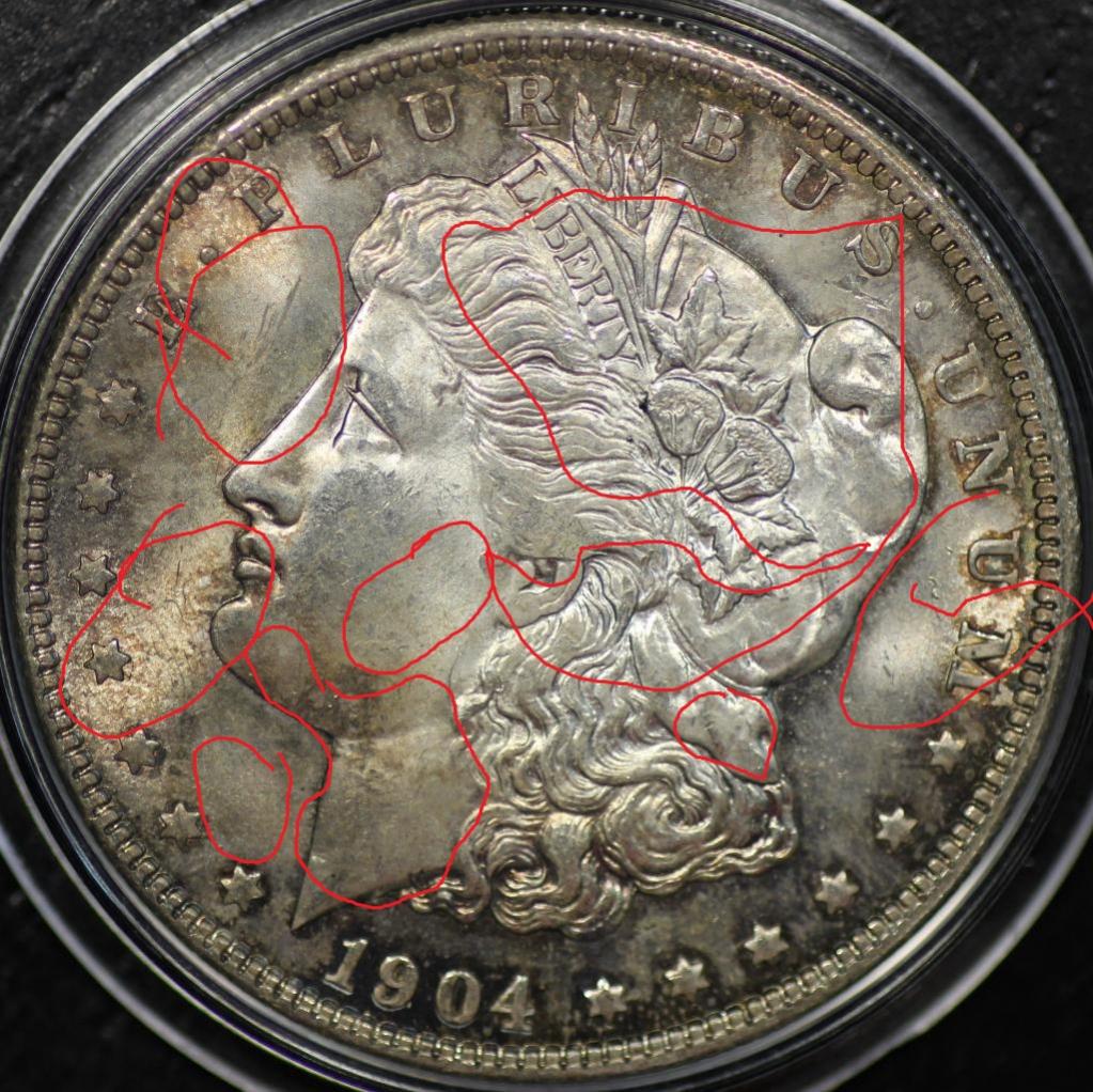 I'll have to politely disagree with you here. Here is a link to an MS65 PCGS-graded 1904-O Morgan Dollar (same date/mm as the OP's): http://www.ebay.com/itm/1904-O-Morgan-Dollar-PCGS-graded-MS65-Very-Lustrous-Frosty-Surfaces-/330803782850?ru=http%3A%2F%2Fsearch.ebay.com%3A80%2F330803782850_W0QQfviZ1&item=330803782850&ViewItem=&nma=true&si=LSsHGtr%252BhswqpltYqGwkwlk528w%253D&orig_cvip=true&rt=nc&_trksid=p2047675.l2557 Notice how the "wear" marks are in the exact same places as the OP's coin. I respect your opinion as an avid and knowledgable Morgan collector (or attic -- whichever you prefer ), but I strongly believe this to be a weak strike. +1; I think the same as well. I would probably lean more on the 64 side though (toning is "meh").
