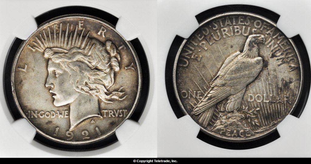 I recently won this 1921 Peace dollar on Teletrade (picture is from Teletrade, with permission). Graded AU50 by NGC, the winning bid was 111$ plus 5$ shipping (no reserve auction). I think it was an interesting buy on my part. It is in no way a "clean" coin (as I knew already), but I liked it anyway. 1921 Peace dollars are very hard to get a good strike, even in the (graded) MS63 coins that I have seen in person, the hair lines clearly visible on my 22's & 23's were missing. Furthermore, a low grade 1921 peace dollar would have cost me at least 100$ (greysheet bid for a VG coin) as the curve is very flat, so I would rather get the higher grade dirtier coin (plus it can go into my registry) than the lower grade "clean" coin. I am happy with the purchase and would like to see what it looks like in hand. Your thoughts are welcome; this was my thought process, and I would love to know what my fellow collectors think about it.
