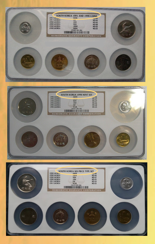 Sure! Why not the image of the 1998 mint set above? There should be no problem for any TPG in certifying/grading this set: All 1998 BOK mint sets have 1991-dated Five-Won and One-Won coins in them (since none were produced that year; they just threw in some leftover 1991s), while the other four coins are dated 1998. Even more egregious is the fact that the multi-holder set in the middle has a "data card" that actually states that the Five- and One-Won coins are dated "1998." Checking the dates on the reverse images of this sets, they're 1991, of course. Obviously, the people at NGC didn't even bother to check the dates on the coins for that one... It would be nice to have a consistent labelling applied to these mint sets, as well as accurate data cards.