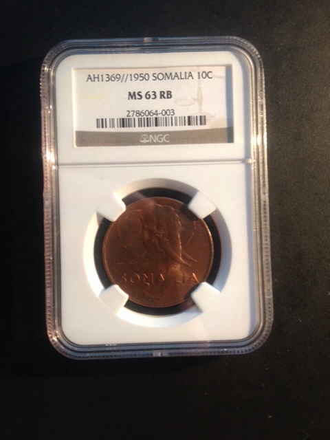 Up for sale I have a 1950 Somali 10 centisimi. Graded ms63 rb by NGC. What is unique about this coin is that it has a rotated reverse, which is rare on Somali coins. Originally it was not sent in to NGCs error service, so it does not bear a error label. If resubmitted to NGCs error service, they will put a error label on it. I have confirmed this with NGC and can furnish email proof on request. Price is $12 shipped. Pm if interested.