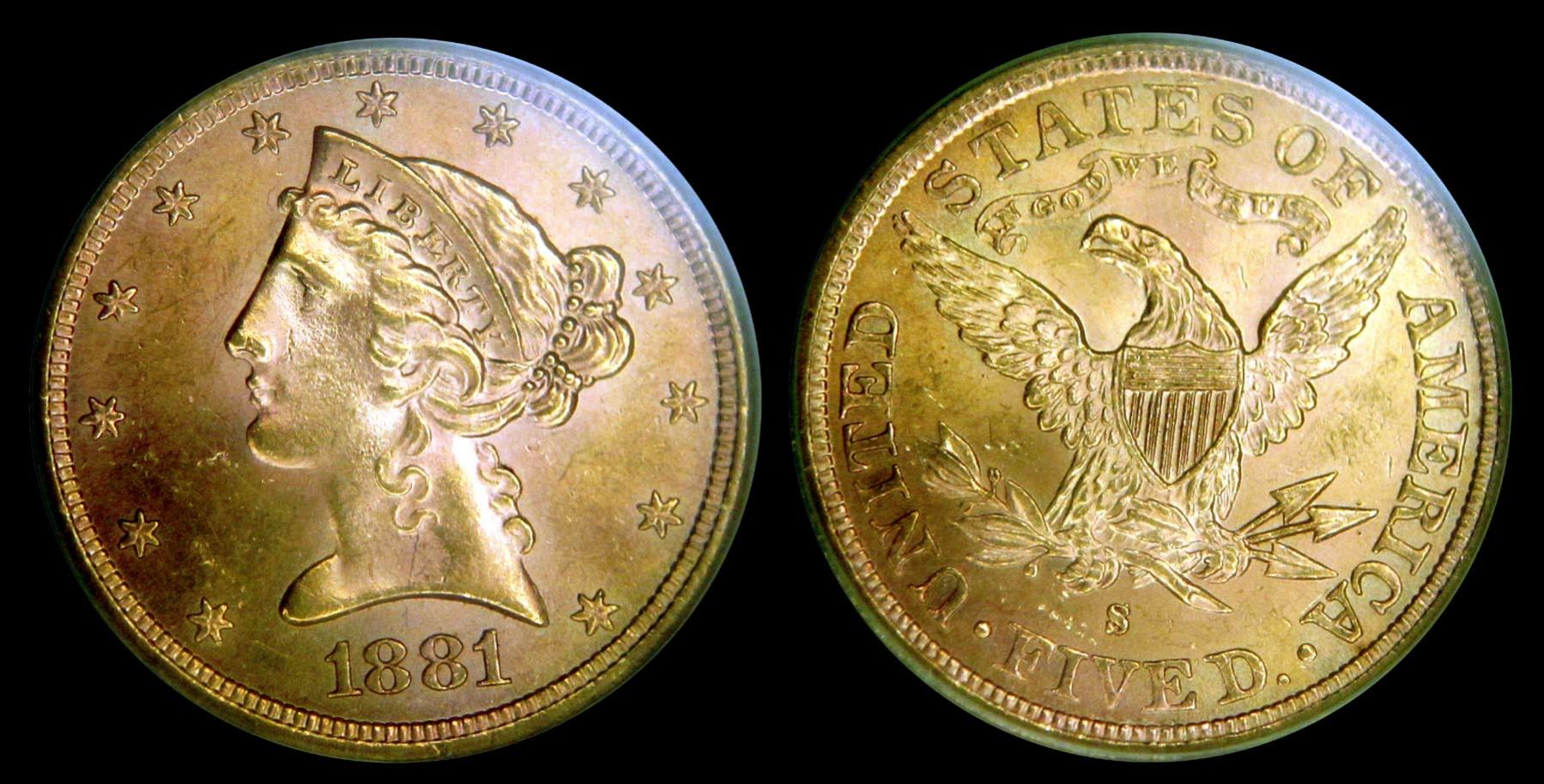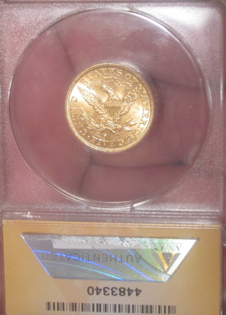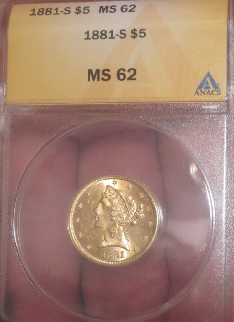 I forgot to mention that it is freshly slabbed MS-62 by ANACS. This Coronet $5 dated 1881-S includes $423 worth of gold & cost only $445. The fact that gold recently went down a couple dollars may have scared the dealer so perhaps he was anxious to sell this particular coin before gold prices fell any lower. Also, he may have wanted some hard cash since it was a couple days before Christmas. This photo depicts the slab & more accurately depicts the color of the coin.