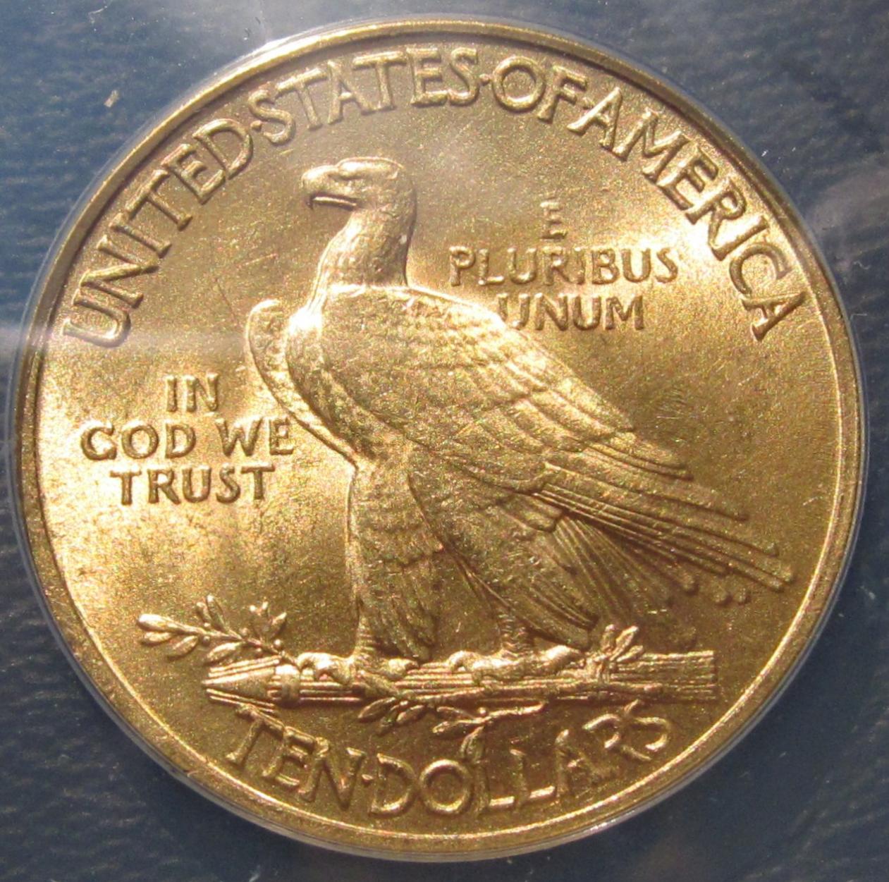 A couple months ago I scoped-out this pretty Indian 10 dollar gold coin. As I recall, I got it for something like $100 over the spot price. The $10 Indian happened to be from the same dealer that just sold me the Coronet five dollar piece. In the case of the $10 Indian, I bought it when gold was apparently going up. In the case of the $5 Coronet, I bought it after gold had gone down about $50/oz.
