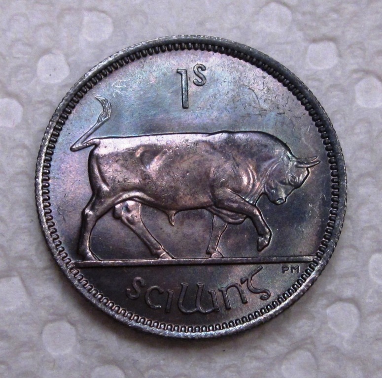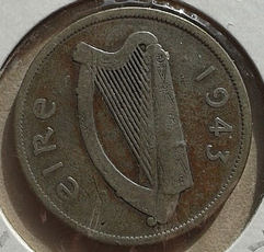 This next Irish coin is a 1-Shilling dated 1942. This coin also has the Irish harp device on the obverse. The reverse device is a bull.