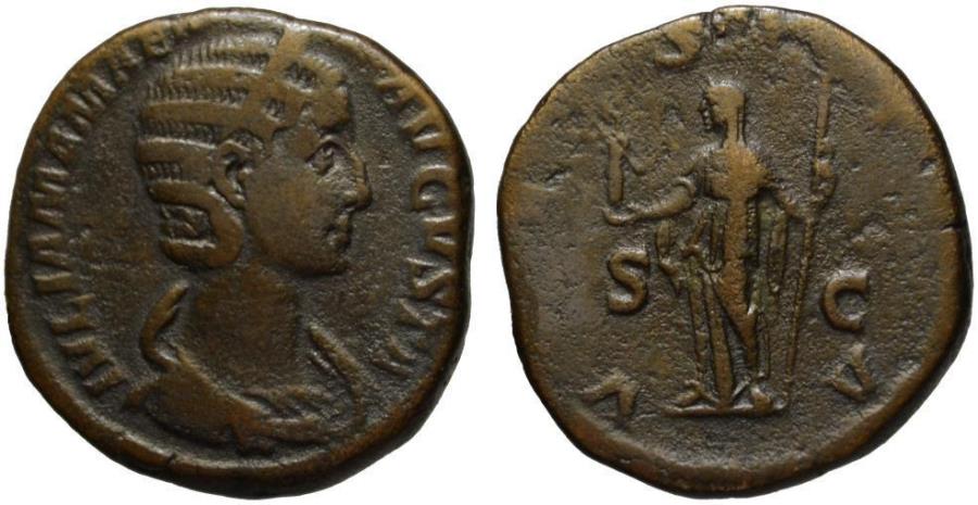 Very fine? Yes. Scarce? A matter of opinion. Sestertius? Yes. Empress Julia Mamea? Half credit for almost spelling it correctly. 1st Century? Uh ... no. Julia Mamaea, AD 222-235. Roman orichalcum sestertius, 21.15 g, 29.5 mm, 1 h. Rome, 6th emission, AD 226. Obv: IVLIA MAMAEA AVGVSTA, diademed and draped bust, right. Rev: VESTA S C, Vesta standing left, holding Palladium and scepter. Refs: RIC 708; BMCRE 389-91; Cohen 83; RCV 8236.
