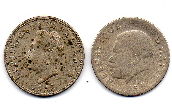 The Schön says the coin from El Salvador - 1952 was apparently minted in the US - is Cu Ni12 Zn18. (Which means Cu70, I guess; the 1977 issue minted in France is Cu65.) For the coin from Haiti it just mentions the Cu-Ni-Zn alloy, without further details. Christian