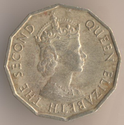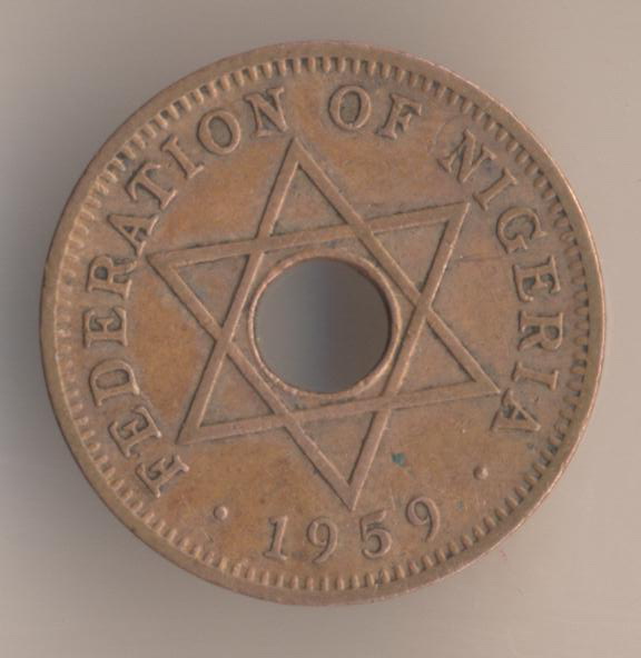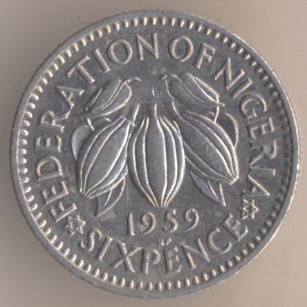 Federation of Nigeria. Sixpence 1959, copper-nickel, weight - 2,5 g., size - 17,5 mm, thickness - 1,4 mm, mintage - 35000000 pcs. Engraver: Cecil Thomas (obverse) & Thomas Humphrey Paget (reverse).
