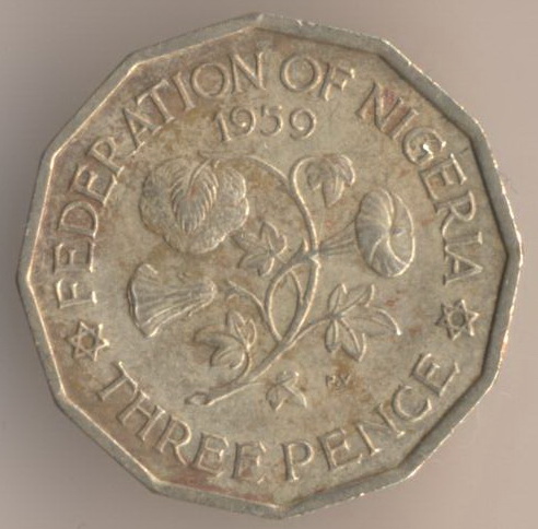 Federation of Nigeria. Three pence 1959, brass, weight - 3,3 g., size - 19 mm, mintage - 52000000 pcs. Engraver: Cecil Thomas (obverse) & Paul Vincze (reverse).