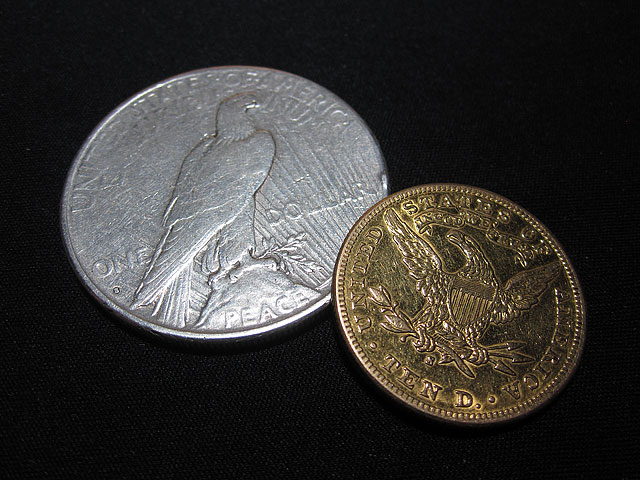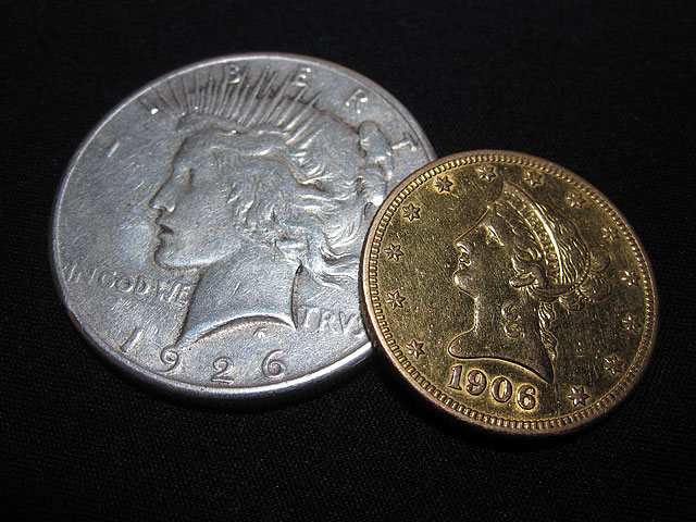 Pocket Money These two coins are not in the best shape, but they are special to me. They are my wallet coins; I carry them with me all the time. My dad gave me the silver dollar in memory of my grandfather on his side, who was born in 1926. He regularly carries three of them, and each of my brothers carry one as well. The eagle isn't of sentimental value just yet. Somebody cleaned it years ago, so I was able to get it for a hair under melt at my favorite shop. As my dealer called it "just an honest piece of gold," I felt that it deserved a bit of honest wear as my lucky gold piece, so now it lives in my wallet.