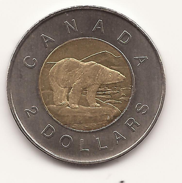 The middle of the toonie where it is a different colour it is off centre and is the same on the back.