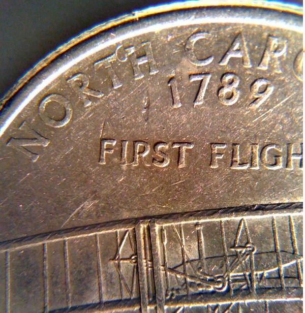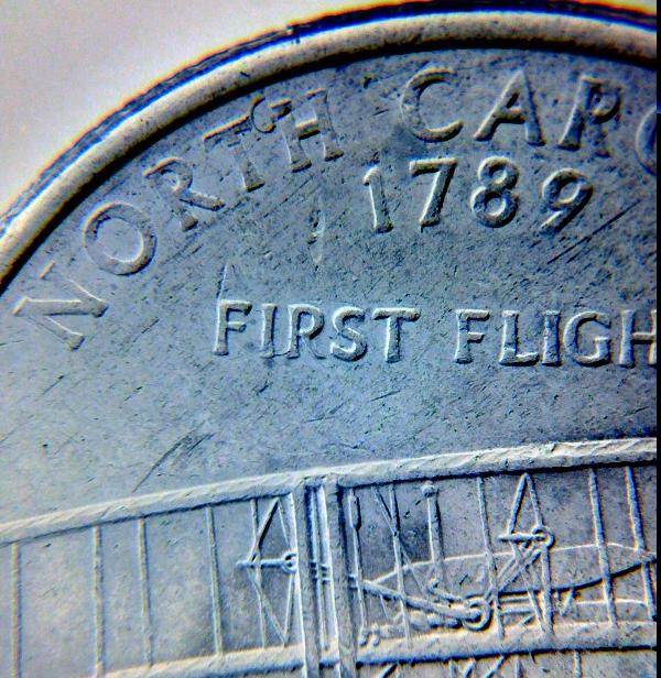 North Carolina State Quarter -- Error Types? I found this quarter yesterday and it seems to have a few issues (listed below) so please let me know what type of errors you think these may be. Thanks, Philip 1. Raised C shaped mark coming from the edge of the T in North. Die break? 2. A small crack running across the C in Carolina. ? 3. Recess to the left of 1789. Lamination? Damage?