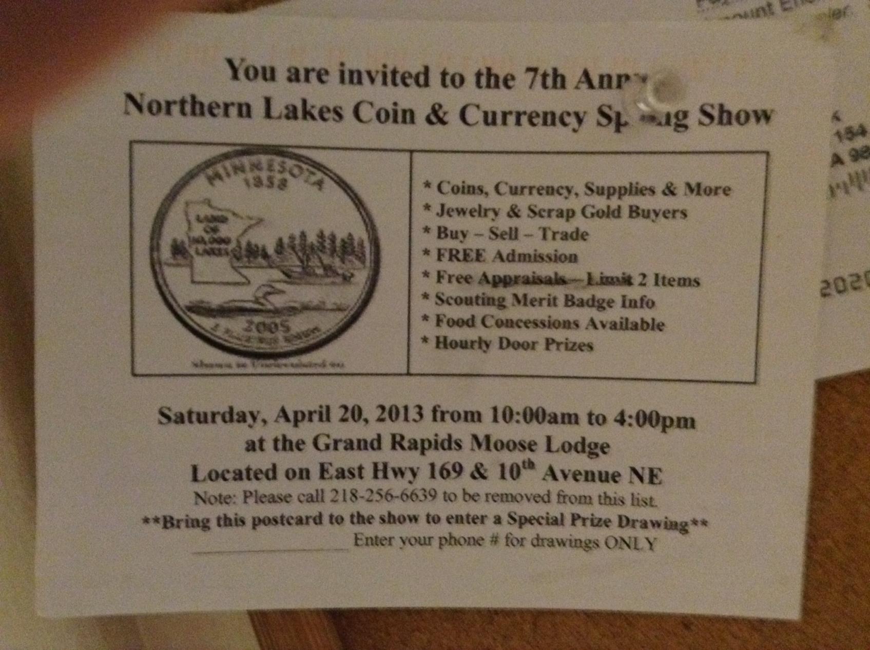 Im going. I had a great time the last time I went. Its a small show, but fun and some of the dealers were very personable fellas! I didn't share it at the time, but I had an awkward moment at that show. Check it out: I was trying to negotiate a possible trade + cash for a National note from my hometown. We had been gabbing for a bit, and compared and allowed each other to examine stacks of notes (his were far nicer than mine. ) He had already taken out two stacks of notes in holders and after he came to realize I wasn't playing games he decided to show me his private collection. I was excited to see it; I remember mentioning it in the other thread. We decided to clear the top of his case for viewing. I brought my stuff to the show in a big zippered binder, and as I was replacing my notes into the binder I heard the dealer say, "where's that other stack of notes?" I just kinda froze, not immediately knowing what to do... I opened my binder back up all the way, unasked, looked at him and just shrugged a little. After looking around quickly, he realized he had shuffled the two stacks of notes in holders together. We just shrugged it off, and no further mention was made. Like it never even happened, though it now will live on eternally here Needless to say though, that when prior to the vibe killer he had seemed more amiable to my offer, afterward he only wanted cash, and I know it seemed higher than retail because he knows I wanted a National from my hometown. Then again, they were part of his personal stash, and they were GEM. Then again, THEY were GEM, meaning he had duplicates... Maybe next time. Some of you may remember a certain memorable purchase.... . So are there any other fellow Minnesotan CT members attending? Or am I really as far out in the sticks as I deny I am? . Conveniently slated for the Saturday on my weekend off, on 4-20-13. From 10am-4pm in Grand Rapids, MN and hosted by the Northern Lakes Coin Club. Hope to meet a fellow CT'er in the real world some time!