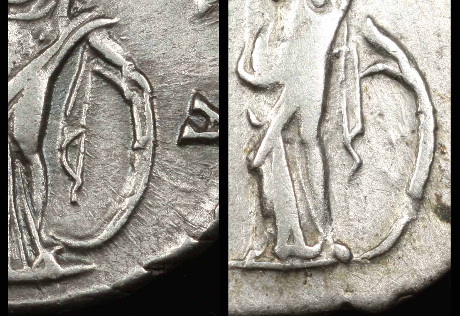 2. The presence of a shield would indicate a Venus Victrix type; this avatar of Venus does not typically appear on coins holding a globus. Rather, she is most frequently depicted holding a helmet ...