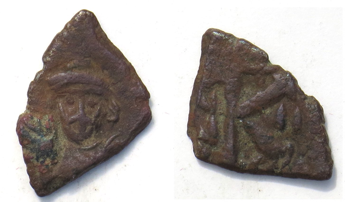 Sear 1262. Justinian II, first reign (The story of how he managed to have two reigns is fascinating). Look at the shape and you can see how it is a piece of a larger coin chisel-cut into four quarters.