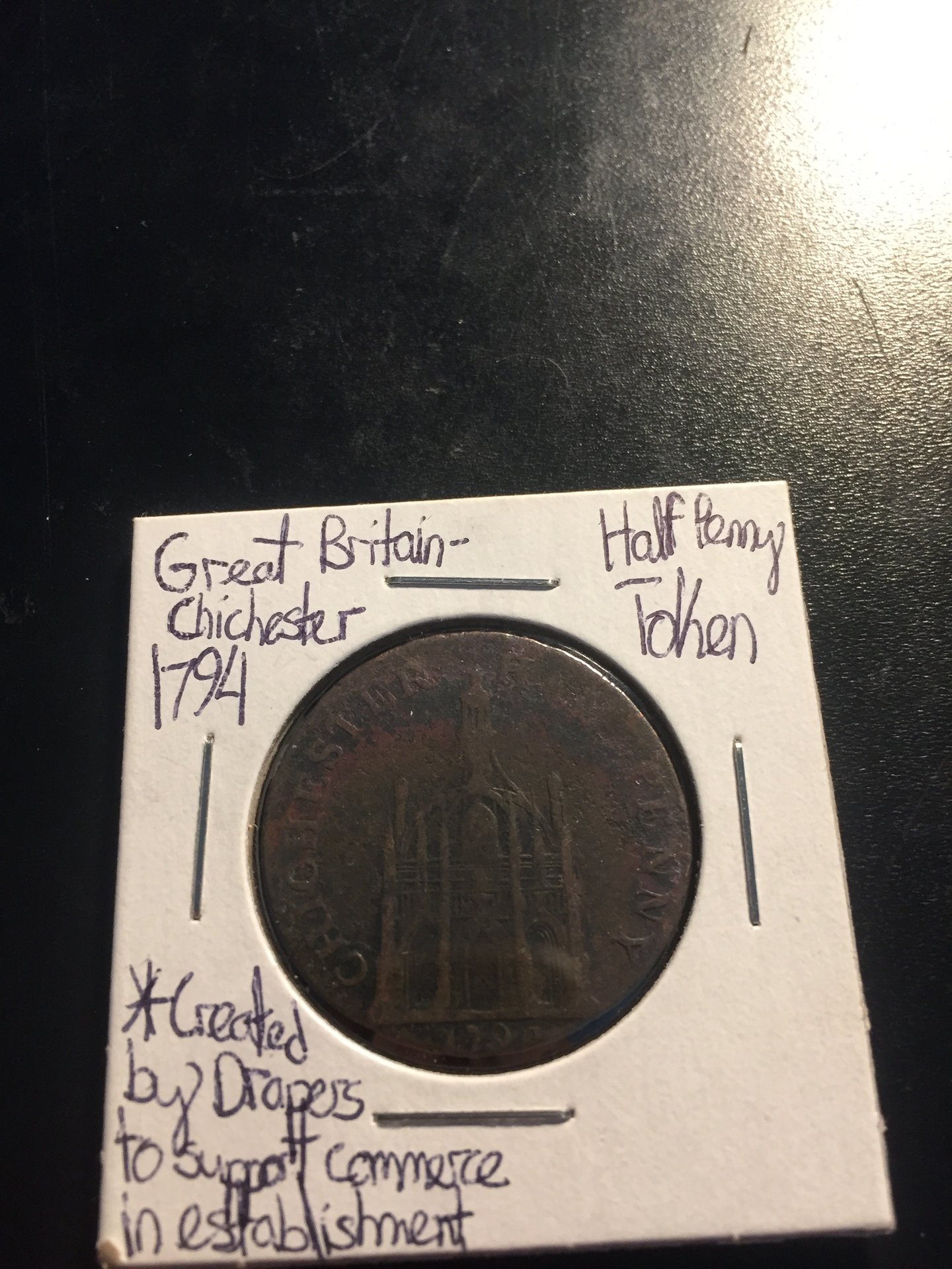 I love this particular Conder token type (D&H 15 Sussex Chichester). The obverse features "Good Queen Bess" (Elizabeth I), while the reverse shows Chichester cathedral.