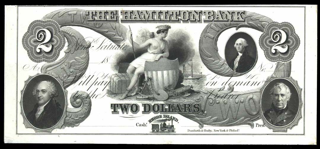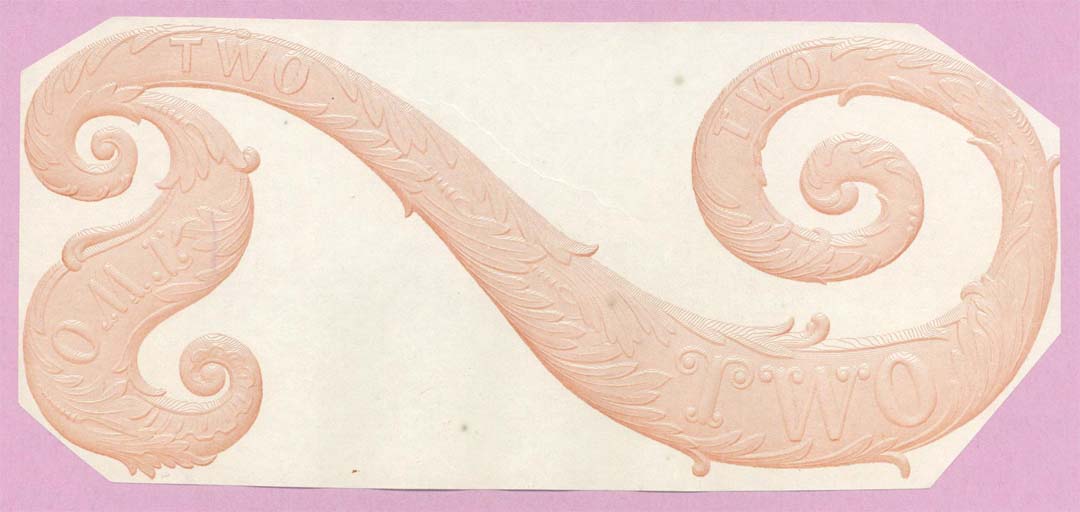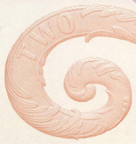 The proof of a $2 note from The Hamilton Bank (not part of my collection) shows how the Lazy 2 was integrated into the design. More often these were used as colored underprints on a note, creating a background tint also very hard to counterfeit.