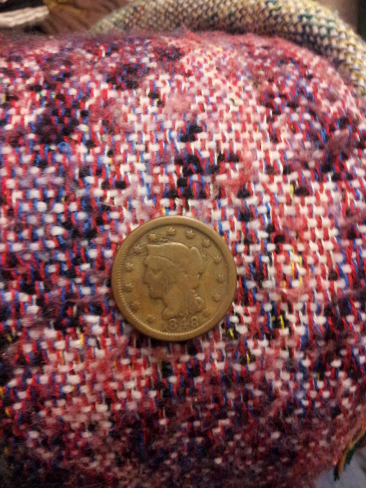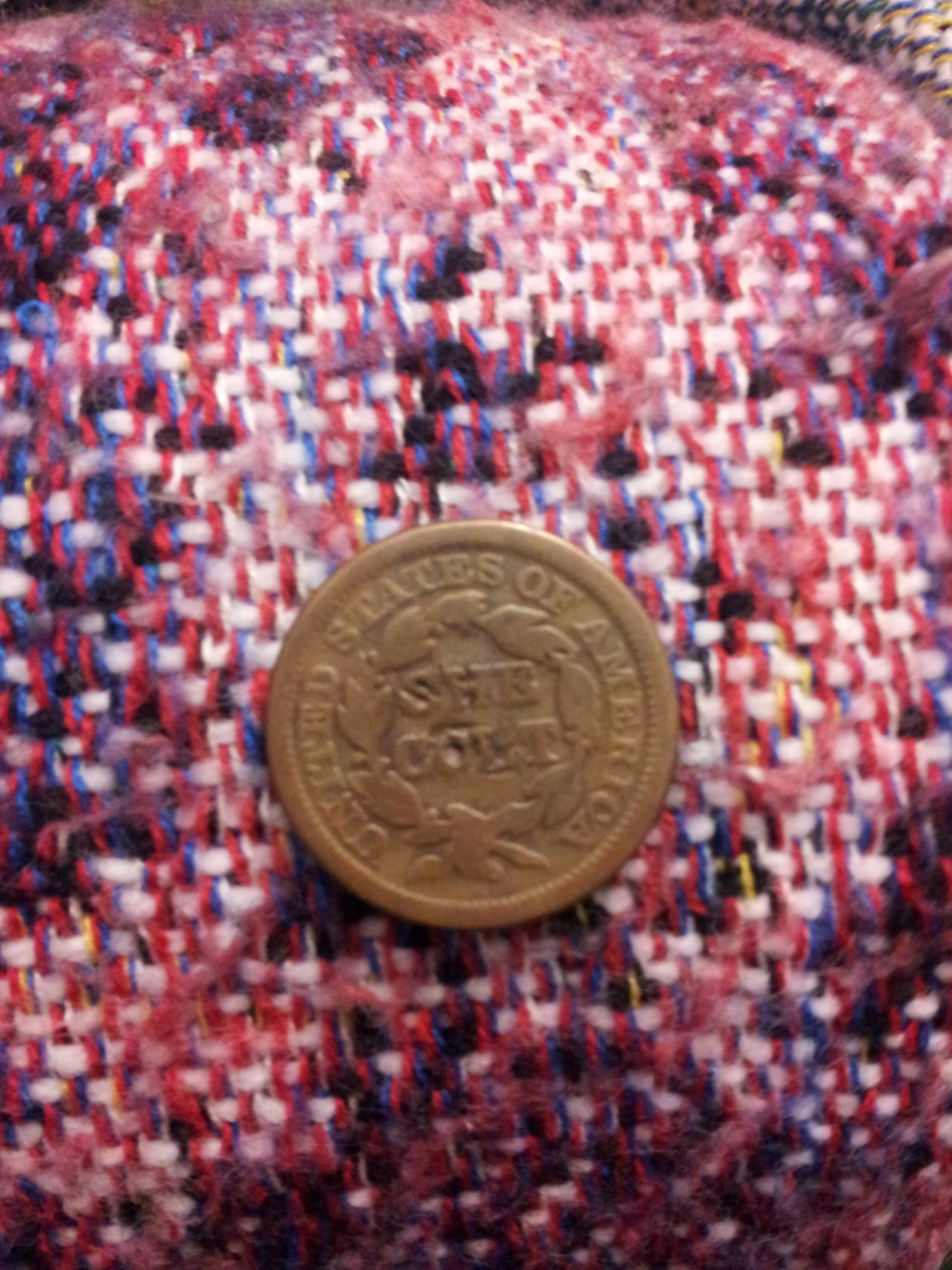 Me and my father were going through his old coin collectionn that was passed down to him before I was even born and we came across a 1848 coin which looks like a typical One Cent coin but on the back it says "She Colt". I was wondering if someone could help me out on this? Im not sure if someone altered them or they came out this way, afterall they are old... Here are a few pictures. Thanks