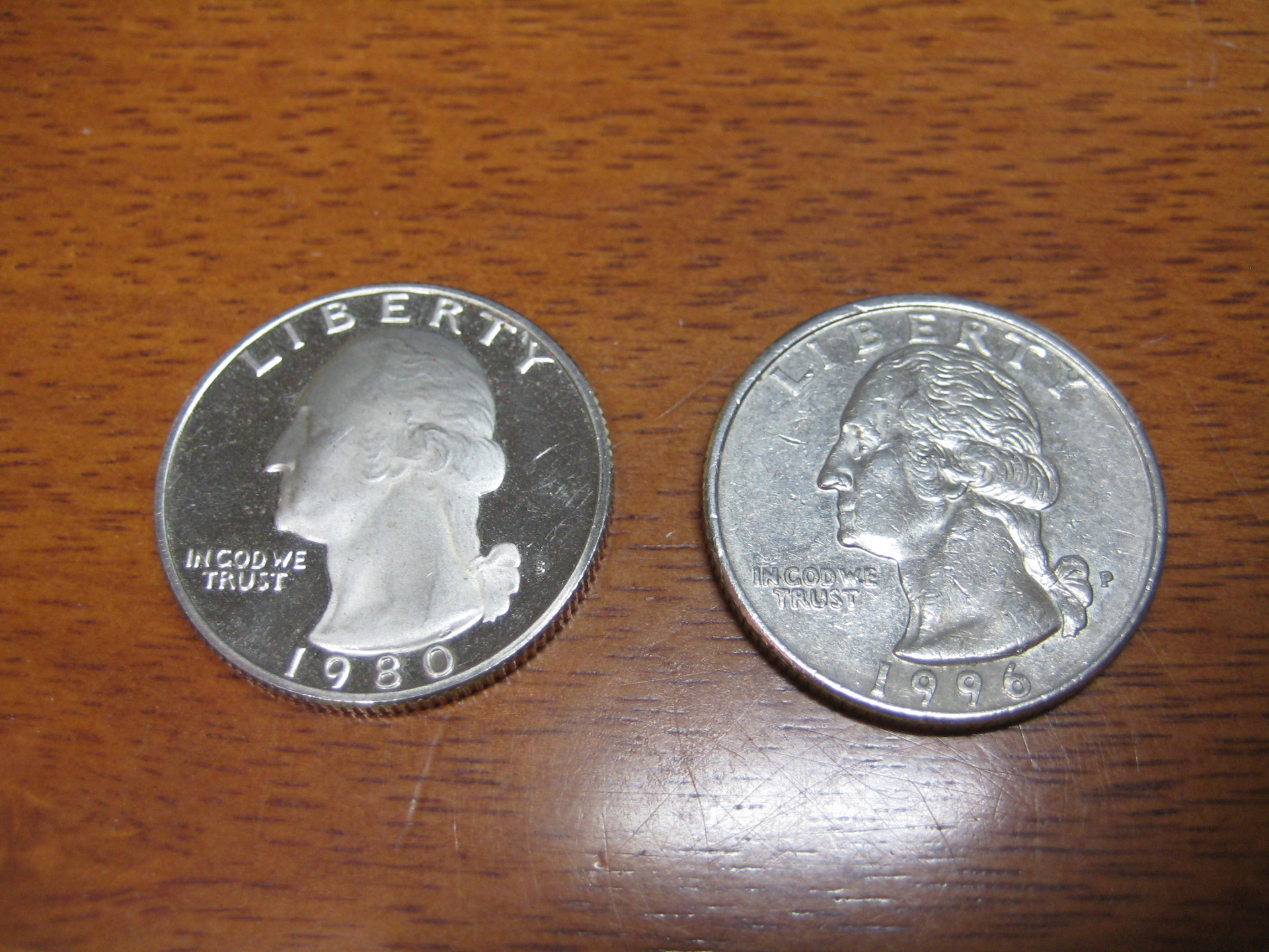 Hey! i have a same coin just like you describe it. in addition to your description, the head character is not shiny with soft and very define lines on it. Any one has the conclusion about it? i have been touching the coin several times, i hope it has no acid nor anything wrong with it. i received it from customer pay at the gas station that i worked for and since its odd, i switch that coin with mine so i can keep it. picture below is the actual coin that i have the 1996 coin is looks normal for me, its just odd that how 1980s coin looks a lot brand new compare to the younger ones such as 1996, i compare it to the very new ones like 2012 ones that are brand new, but the 1980 that i have is shinier than them as well. does it worth anything good? i'm ticked to bring it to pawn star shop when we going to vegas and see what is it all about.