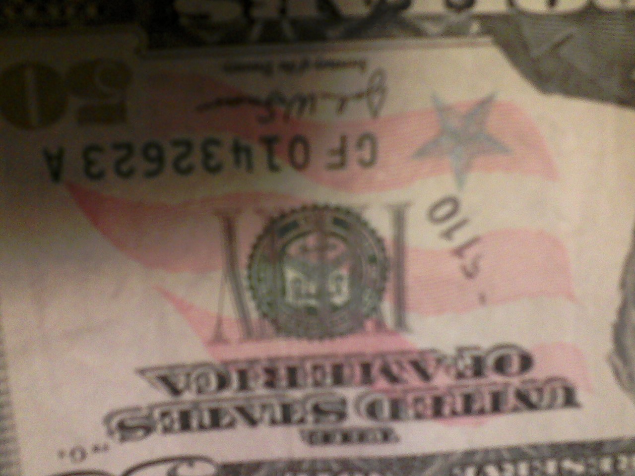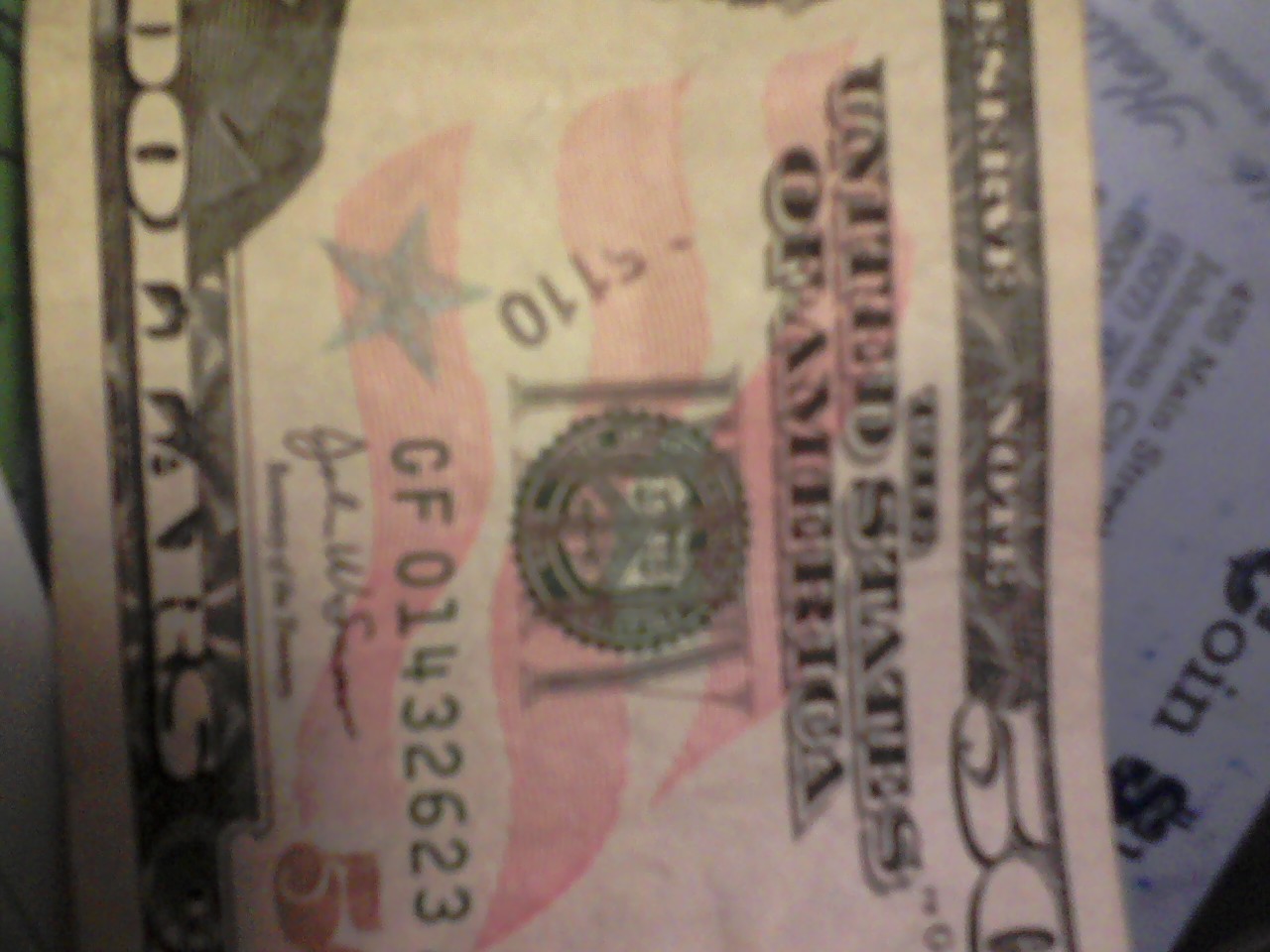 hi all,,,its that time when money rolls in for bdays and my mom gave me this. As a very (very) faint collector of bills I was drawn to the fact that there where numbers printed on the bill. So my Q is this, is it post mint or a real error and how much is it worth?? btw Sorry for the pics...they are coming via cell phone and HAPPY 4TH!!!!! :bart: -Dom