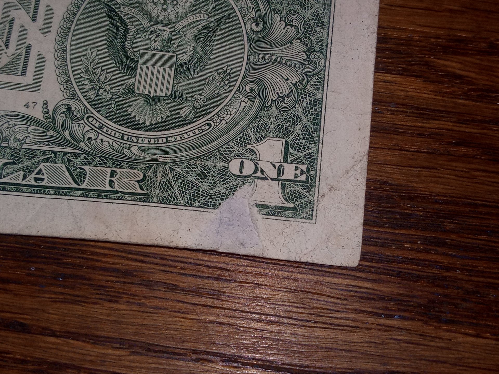 I was counting my paper money today and this popped out at me. First thing is the green above the serial number on upper right. Second is the missing paper on the reverse. How many layers of paper do they use per bill?