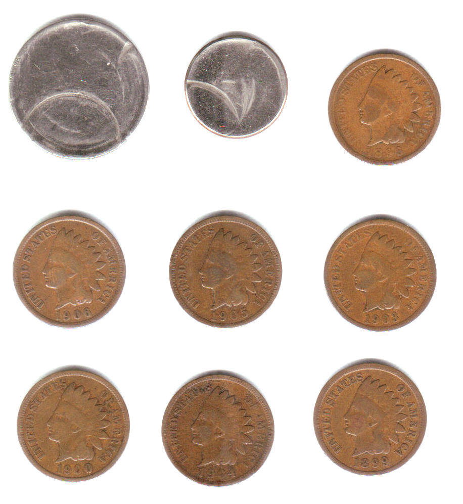 For sale as a lot: 1. Blank planchet, presumably for a clad quarter. 2. Blank planchet, presumably for a clad dime. (on both, the central layer of copper shows clearly) 3. 7 Nice G+ Indianheads, no defects, no crud, no scratches or gouges, dates 1896, 1899, 1900, 1903, 1904, 1905, and 1906. 4. 1972 Bicentennial medal in case with brochure, this is a U.S. Mint issue, not a private issue. Price, $20 for all 4 groups, postpaid. Shipped only to the 48 states. PayPal OR postal or convenience-store money order.