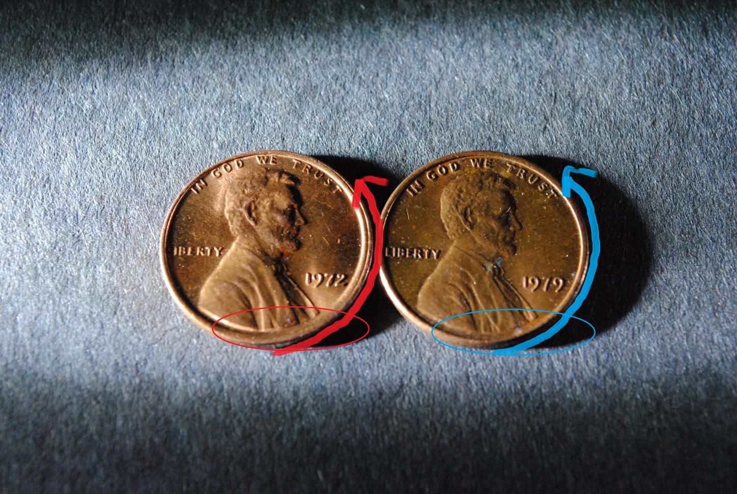 Hello everyone, searched a box of cents and came across this coin. Doesn't the red-circled cent look a little off center? what I am looking at is signaled by the red arrow, comared to a normal cent(blue arrow). Is it an error and is it worth anything? Thanks in advance, scouter35