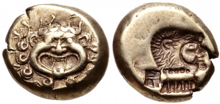 My gorgon: LESBOS, Mytilene. Circa 521-478 BC. EL Hekte – Sixth Stater (11mm, 2.51 g, 11h). Gorgoneion / Incuse head of Herakles right, wearing lion skin headdress; rectangular punch to left. Bodenstedt Em. 19.1; HGC 6, 944. VF, lightly toned. I wish I had more gorgons, it is a really great type to show off to non-collectors especially.