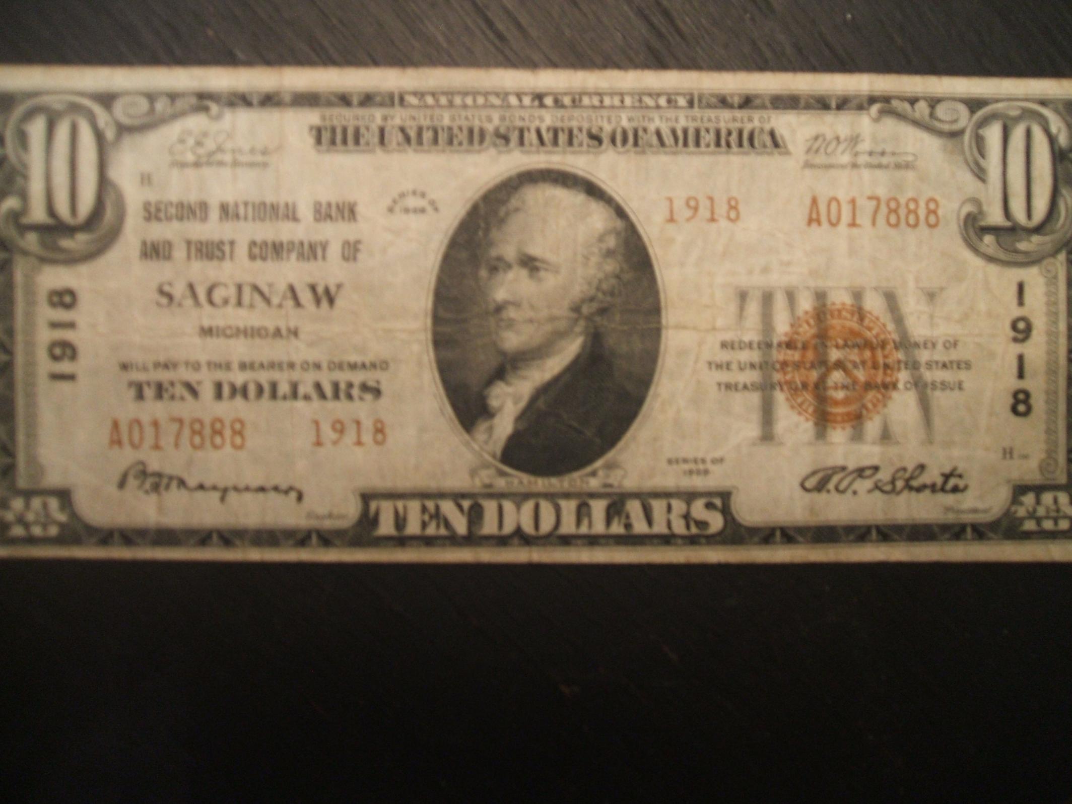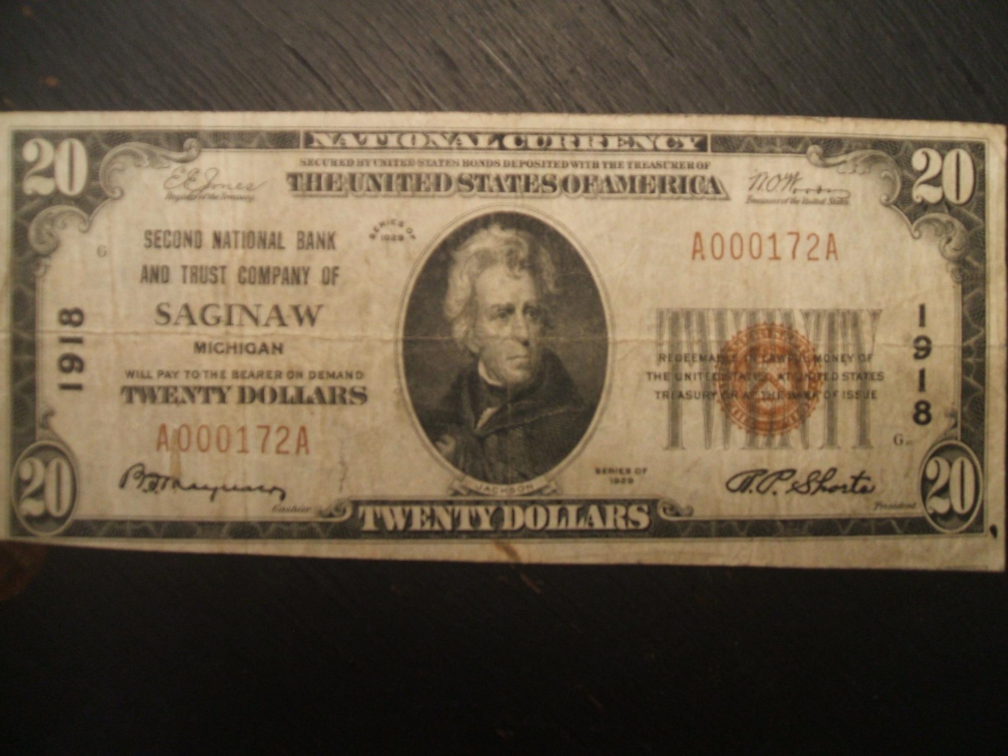 Anyone catch the error on the $20? Looks like you have a piece of another note on there! Don't forget to factor that in! Never seen a '29 mis-cut personally? '29 NBN can fetch anywhere from $40-$400. Unfortunately I can't give you a price, but I can tell you that smaller banks demand a higher premium. You'll have to research realized pricing on those. Don't mistake those notes for '29 FRBN pricing! I swear I saw a Saginaw not to long ago on Ebay, so you might want to check it out! This is what a '29 FRBN looks like.