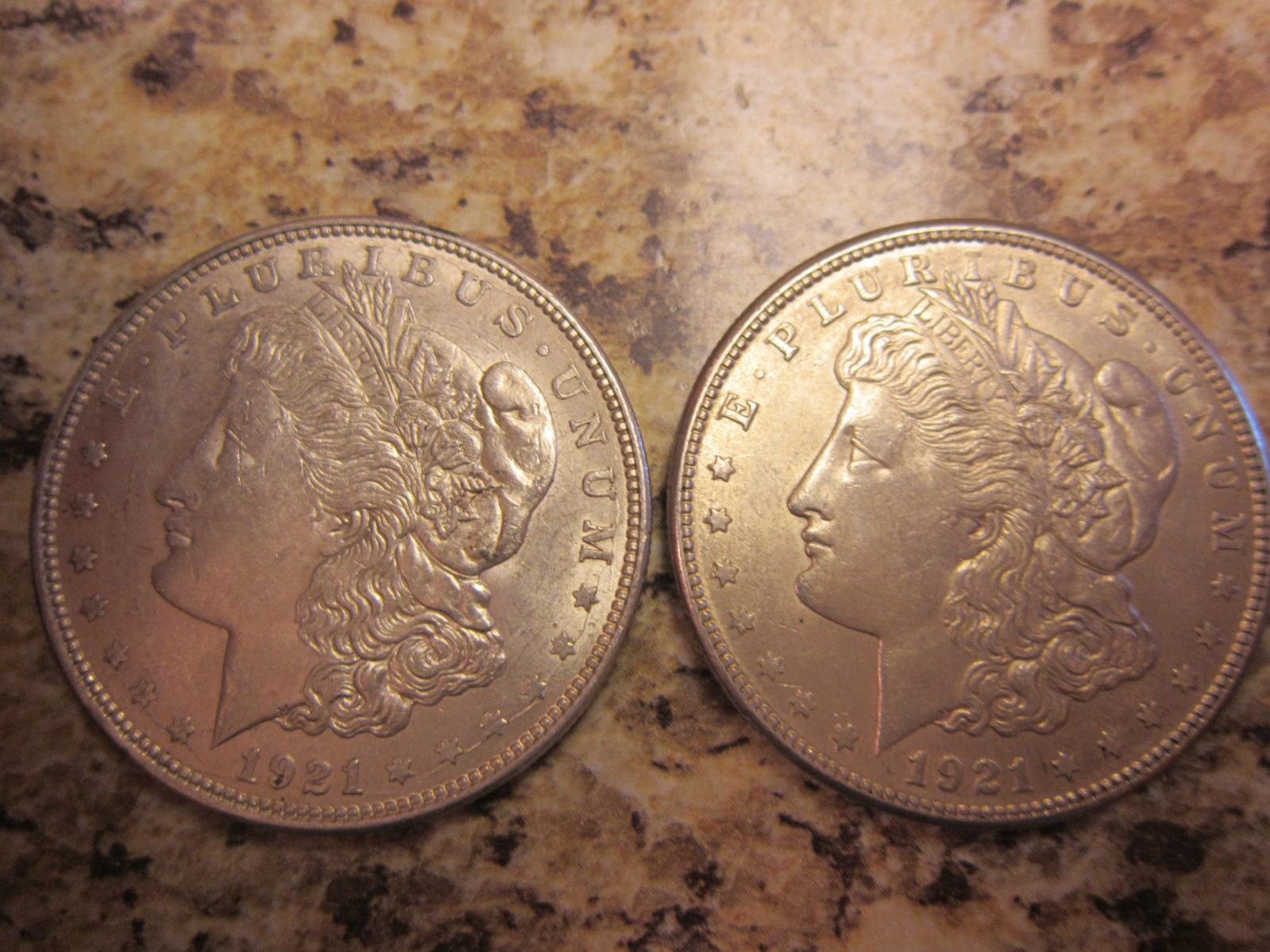 Had the repost this, prior post seems to have moved or been moved to sales/auction forum somehow so deleted and we try this again. (ps I know for a fact i didn't post it in the auction forum) Just got lucky on e-bay. Scored 2 1921 AU/BU morgans One "d" and one "s" for only $60. I'm a happy camper! Now 3 of 4 mint slots in the yearbook filled with 21's Now just need a CC for last slot shame it can't be a 21 too lol.