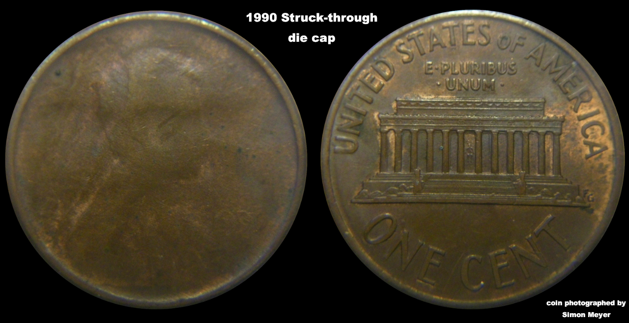non cents I'm thru with this thread and this is my last post on it. you are trying to rely on google too much .what you are missing is that a die cap can become stuck onto a die and every strike will remove a tiny amount of the soft material. when the die is starting to become clear and the die cap almost worn off the center of the die usually becomes clear first . whatever remains of the worn off die cap that is stuck to the die will sometimes look like struck thru grease and still affect the coins being struck.