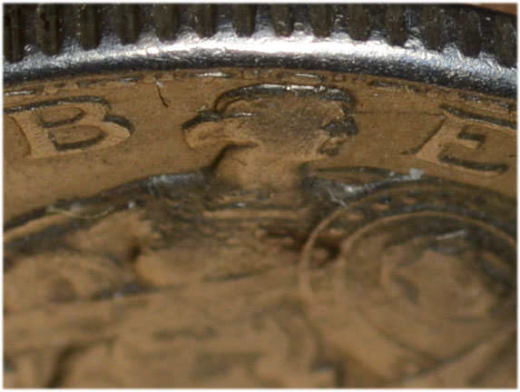 Therefore, whatever created it (if we posit that this isn't a retained strikethrough) had to be something which impressed itself into the die, creating a void. So we have to study this in "negative" mode, seeking something which would be a positive on a die (or whatever object contributed the shape) and therefore capable of creating an impression into a die when broken off and struck through. That makes it unlikely that an existing coin could be the contributor, as they're much softer than the dies. Note the cud above and left of the feature we're discussing, and think about what shape that broken-off area would have if you studied it as an individual fragment. I suspect that cud might be the culprit.