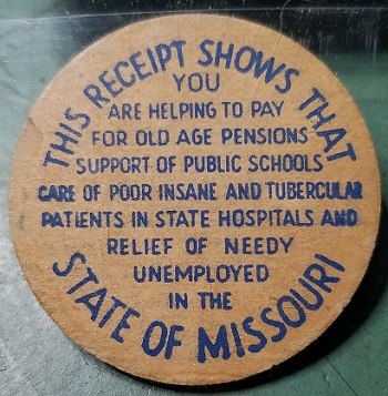 A consumer’s tax token from Oklahoma. The reverse is what caught my eye. For Old Age Assistance. It made me laugh.