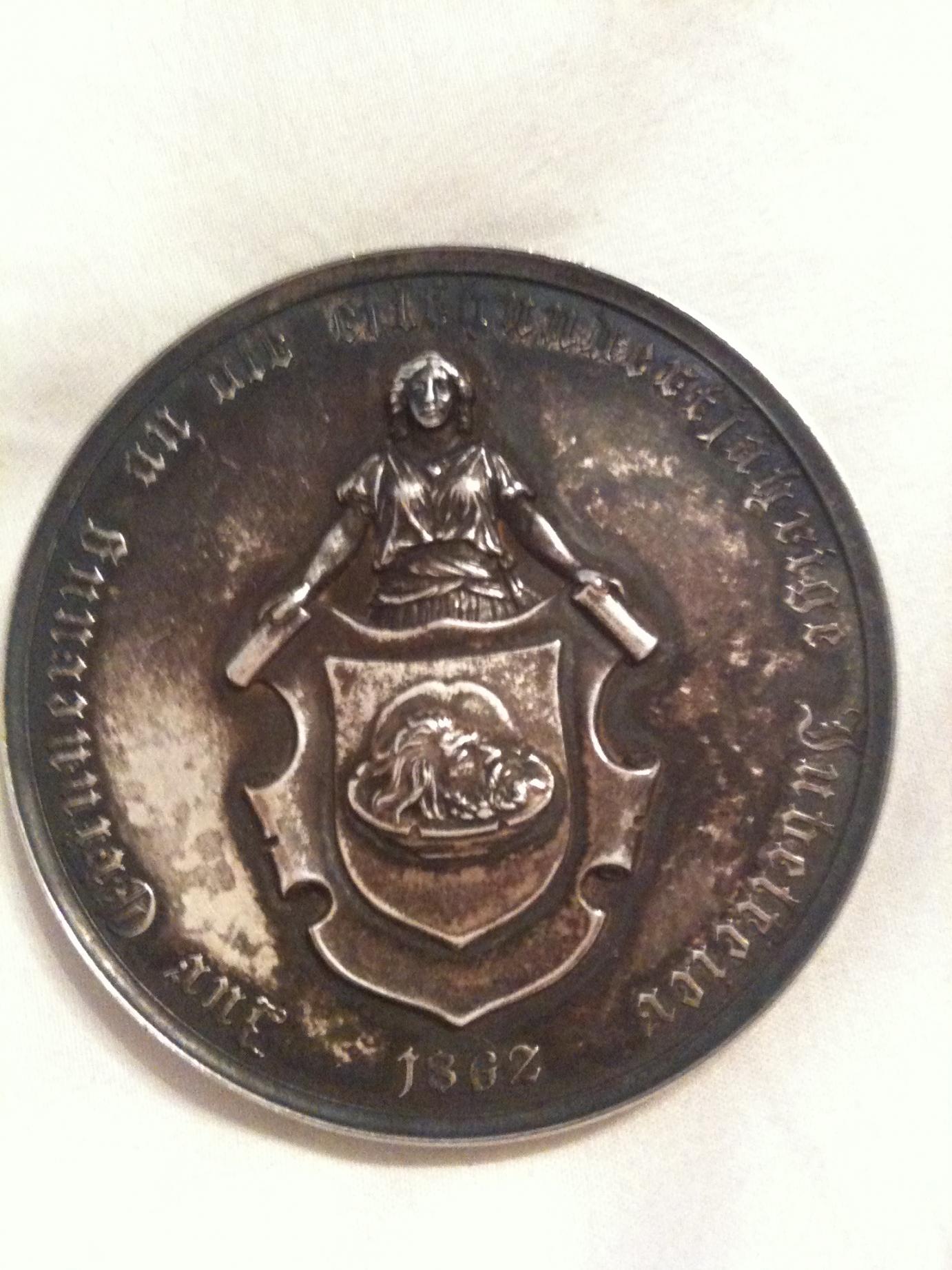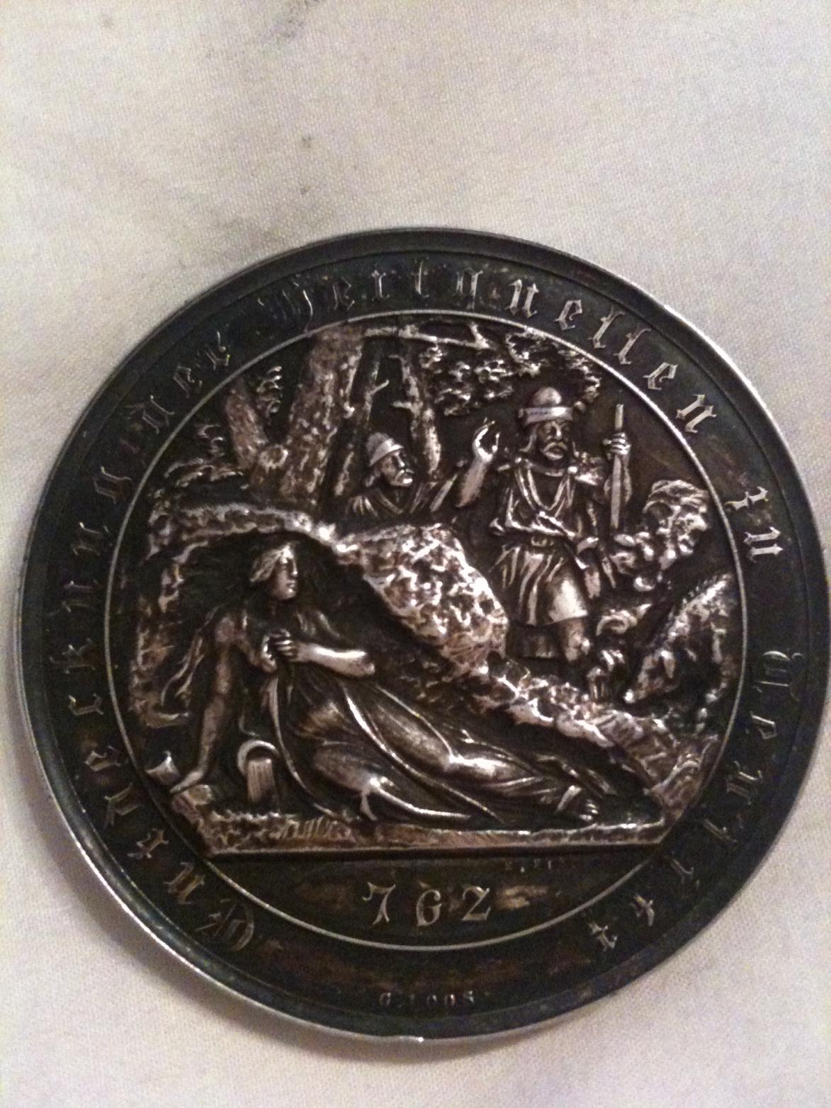 need help wit this coin it came been in the loft for years just discoverd it it black with silver underneath on the first picture in small writing it says g.loos and in even smaller writing it says k.fischer its in old german, ill try and tell you what it says, around the first pic, entdeckung der heilquellen iu c/t eplitl underneath the pic 762,,,, otherside, iur crinnerung an die eilfhundertlahrige jubelfeier and 1862,, please can anyone help email barryward54@googlemail.com