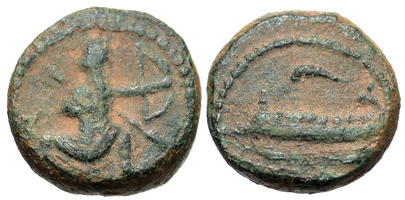 I have several older coins, but my oldest dated coin was produced in 356/5 BC. The upside-down crescent-shaped stroke above the reverse galley is the symbol for 10, which signifies the 10th regnal year of Abd'ashtart I.