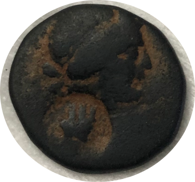 it is just a countermark on half of a coin; but the countermark is quite nice got it in a multiple lot that I bought recently. AE 21 Syria, Apamea (today’s Qalaat al-Mudik), 18 – 17 BC struck under the reign of Augustus 20 x 21 mm, 7.549 g RPC I, 4352; countermark Howgego 201; Ob.: Bust of Dionysos to r. wearing ivy wreath. Countermark of Tyche. Rev.: (ΑΠΑΜΕΩΝ ΤΗΣ ΙΕΡΑΣ ΚΑΙ ΑΣΥΛΟΥ) date (ΕϘΣ) thyrsus tied with ribbon. "Apamea did not mint coins after the mid first century AD. In a publication of the coins in the Antakya Museum, Butcher lists a countermarked coin of the Dionysus/thyrsus type dated by the Seleucid era EΠΣ = 285 = 27 BC. Regarding the mints of the Orontes Valley, based on the data gathered thus far, it seems that only Apamene coins were countermarked. Howgego lists a countermark in the shape of Tyche’s head applied on coins of Apamea, all of which are of the Dionysus/thyrsus type. The author considers this to be perhaps a countermark for indicating a lower denomination." Quoted from Univeristy of Warwick, Nurpetlian Jack Antoine, Doctor of Philosophy Thesis, “COINAGE IN LATE HELLENISTIC AND ROMAN SYRIA: THE ORONTES VALLEY (1ST CENTURY BC - 3RD CENTURY AD)” at https://wrap.warwick.ac.uk/57324/1/WRAP_THESIS_Nurpetlian_2013.pdf