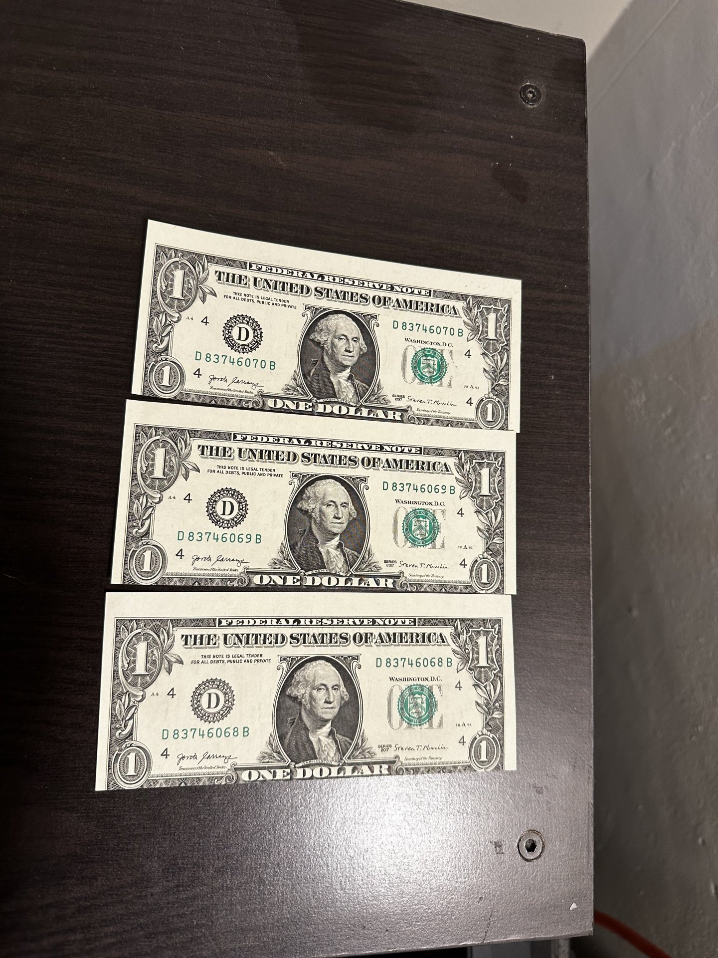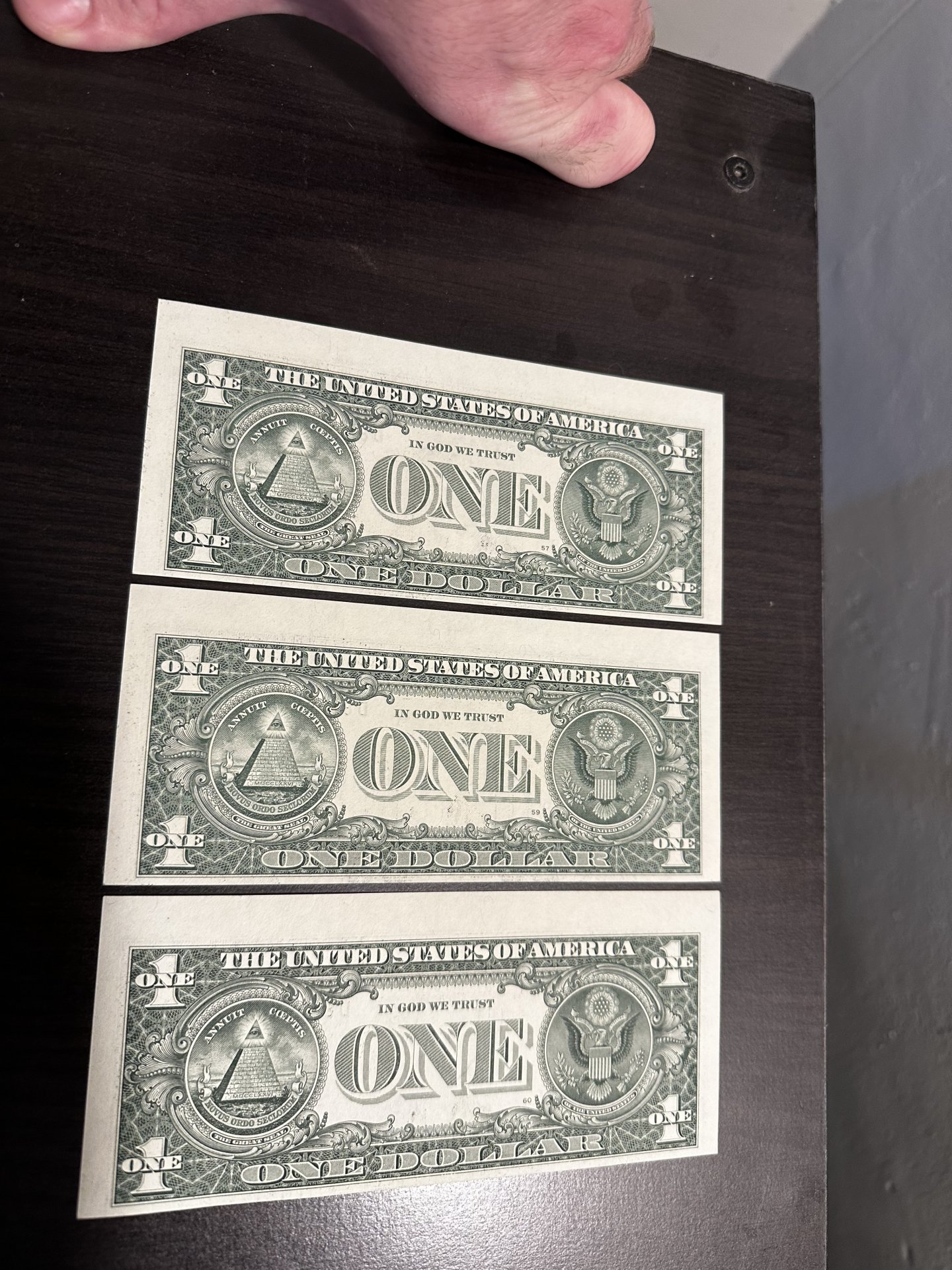 I have a set of dollar bills that seem to have an error on it I’m not sure if they are worth anything they are in a series however all three back plate numbers are out of order series on front 70, 69, 68 then the back plate numbers respectively are 57,59,60