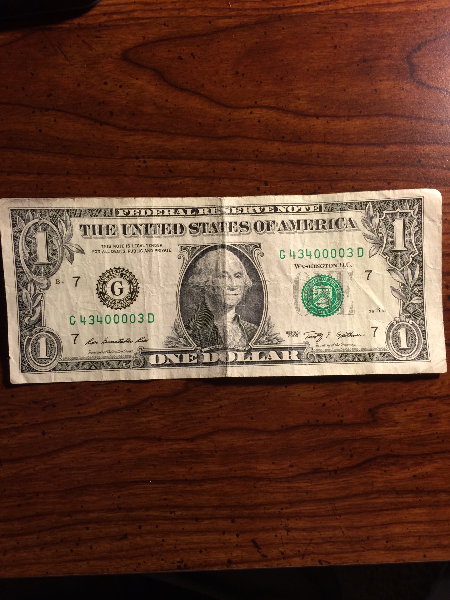 Found this dollar bill in my change today. In very poor condition, but I liked the serial number so I think I'm going to keep it. Let me know if you think it has any worth?