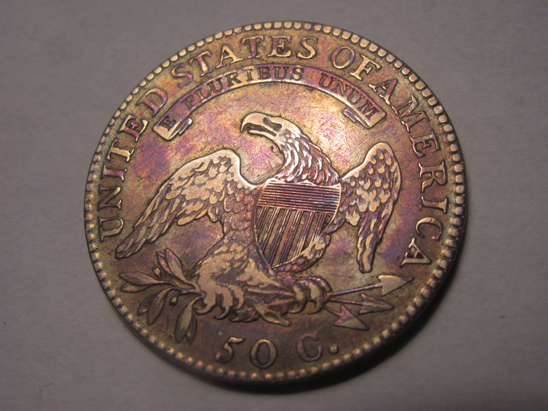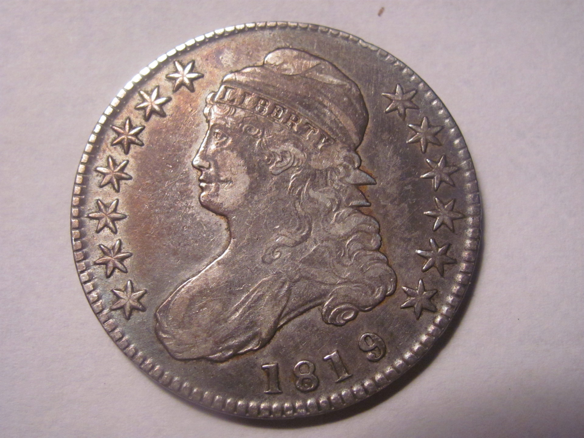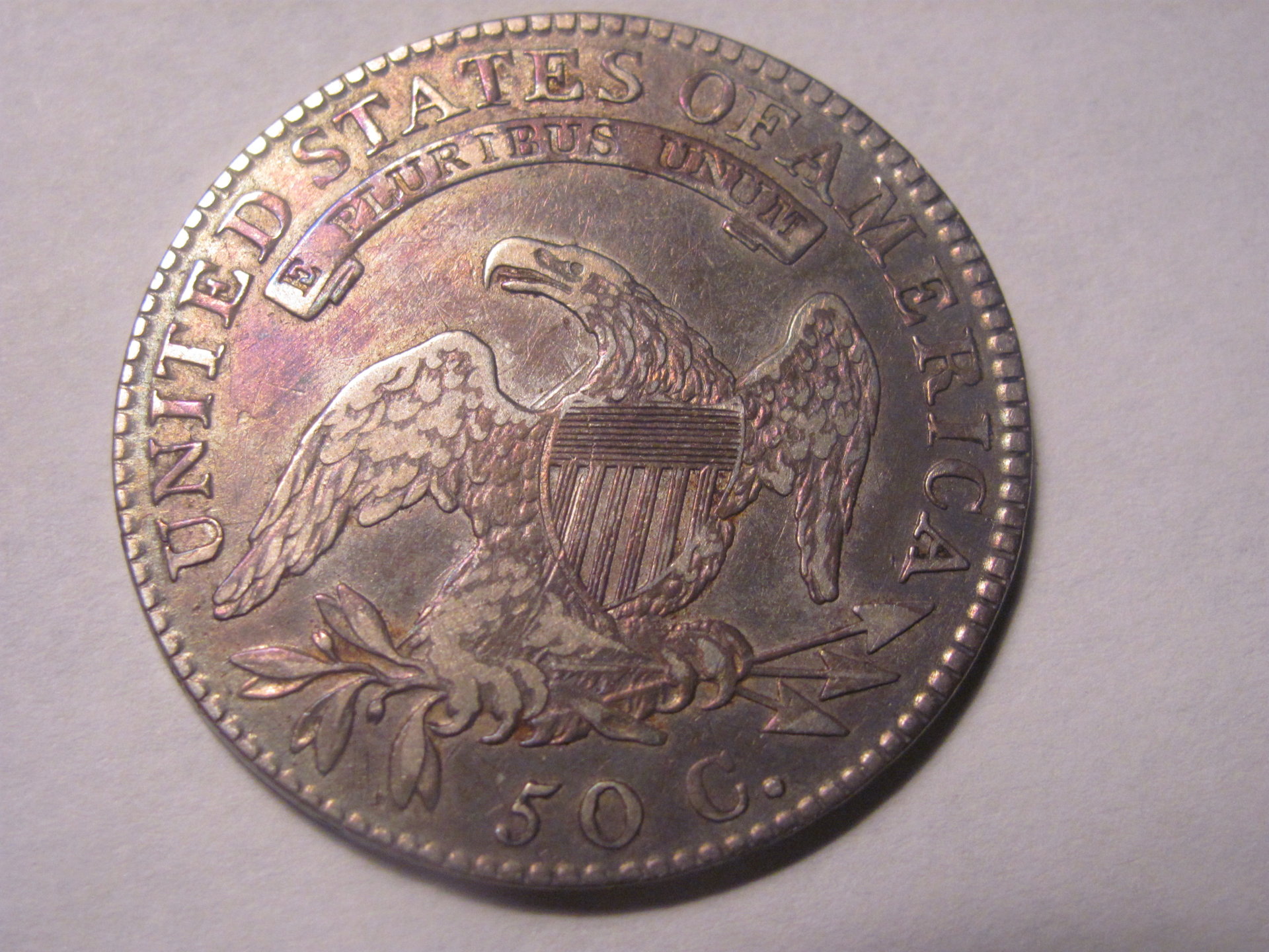 Hello everyone, I picked up a bust half dollar yesterday and would appreciate some opinions on its grade and authenticity. The coin weighs 13 grams (scale does not give tenths place) and it has the appropriate edge lettering for the year. The coin has a purple iridescent toning (primarily on the reverse) when held at a certain angle. I know having it in hand is key and that photos make a world of difference in lack of that option- so hopefully they are good enough. I'll appreciate your opinions! Thanks so much