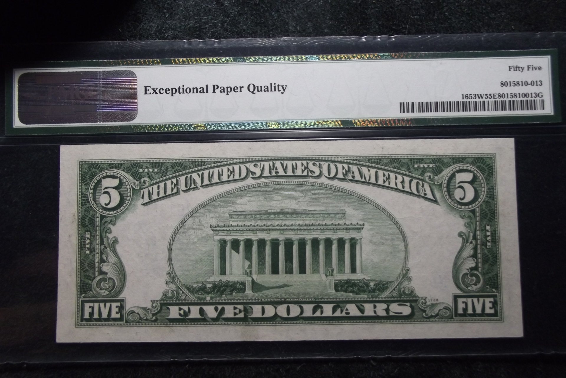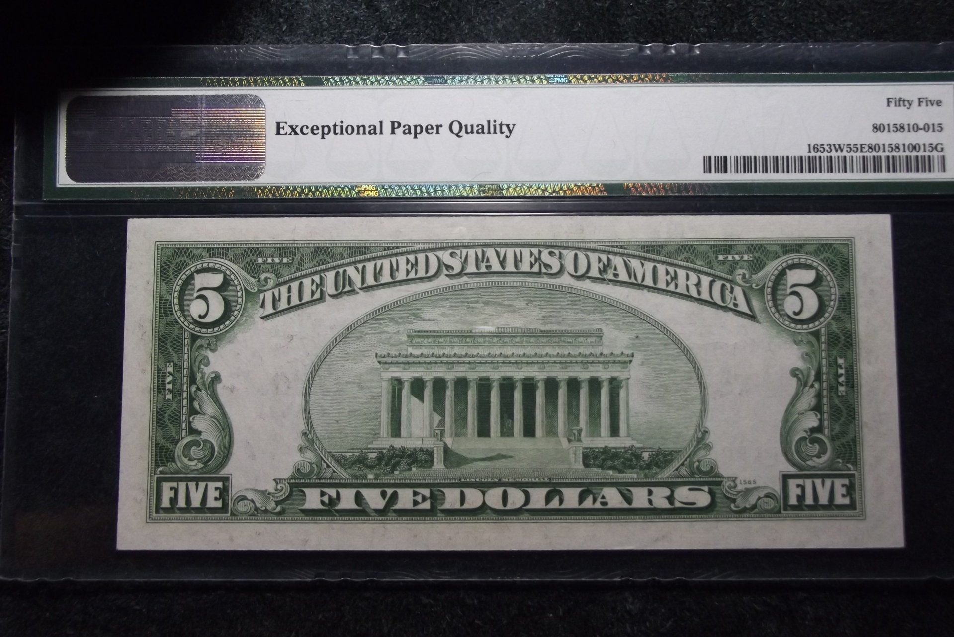 OK, upon further review I guess the staining on both notes accounts for the 55 grade. Also on 1 in the light at a certain angle I saw a faint verticle line down the center. I still like these notes and for the price I'm not disappointed. Thanks for all the input.