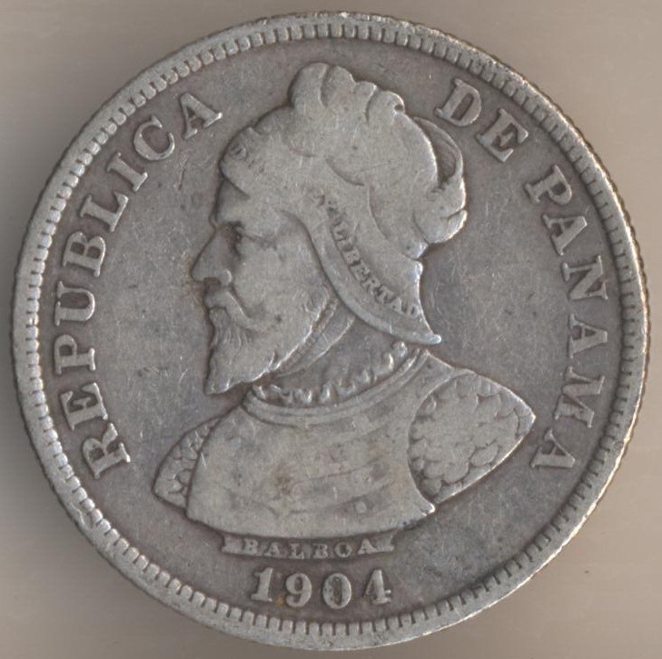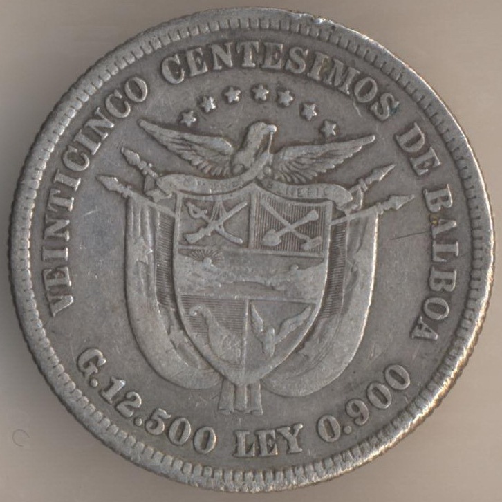 25 centesimos of balboa 1904, silver .900, weight - 12,5 g., size - 30,6 mm, mintage - 16000000 pcs. Single release only.