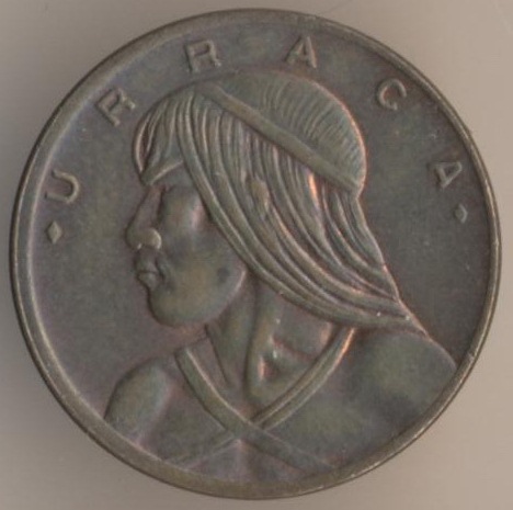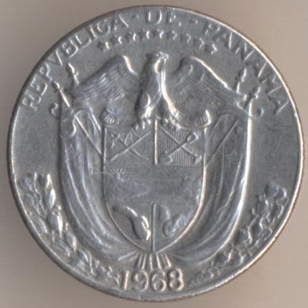 One decimo (1/10) of balboa 1968, copper-nickel clad copper, weight - 2,27 g., size - 17,9 mm, thickness - 1,35 mm, mintage - 5000000 pcs. Minted in London. A coins of this type were released at 1966-75, 1980, 1982-83, 1986 and 1993.