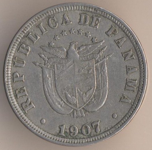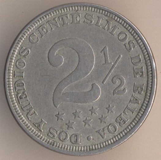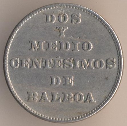 2-1/2 centesimos of balboa 1907, copper-nickel, weight - 5 g., size - 21 mm, thickness - 1,9 mm, mintage - 800000 pcs. A coins of this type were released at 1907, 1916 and 1918.