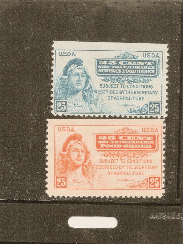 These stamps were never intended for use as postage and they have no gum on the back. They were issued in booklets of four, so you will always see at least one straight edge on them. The orange ones could be used to buy anything (except alcohol) and the blue ones were only for commodity foods like dairy, eggs and produce. The cashier would tear them out of the booklet as needed.