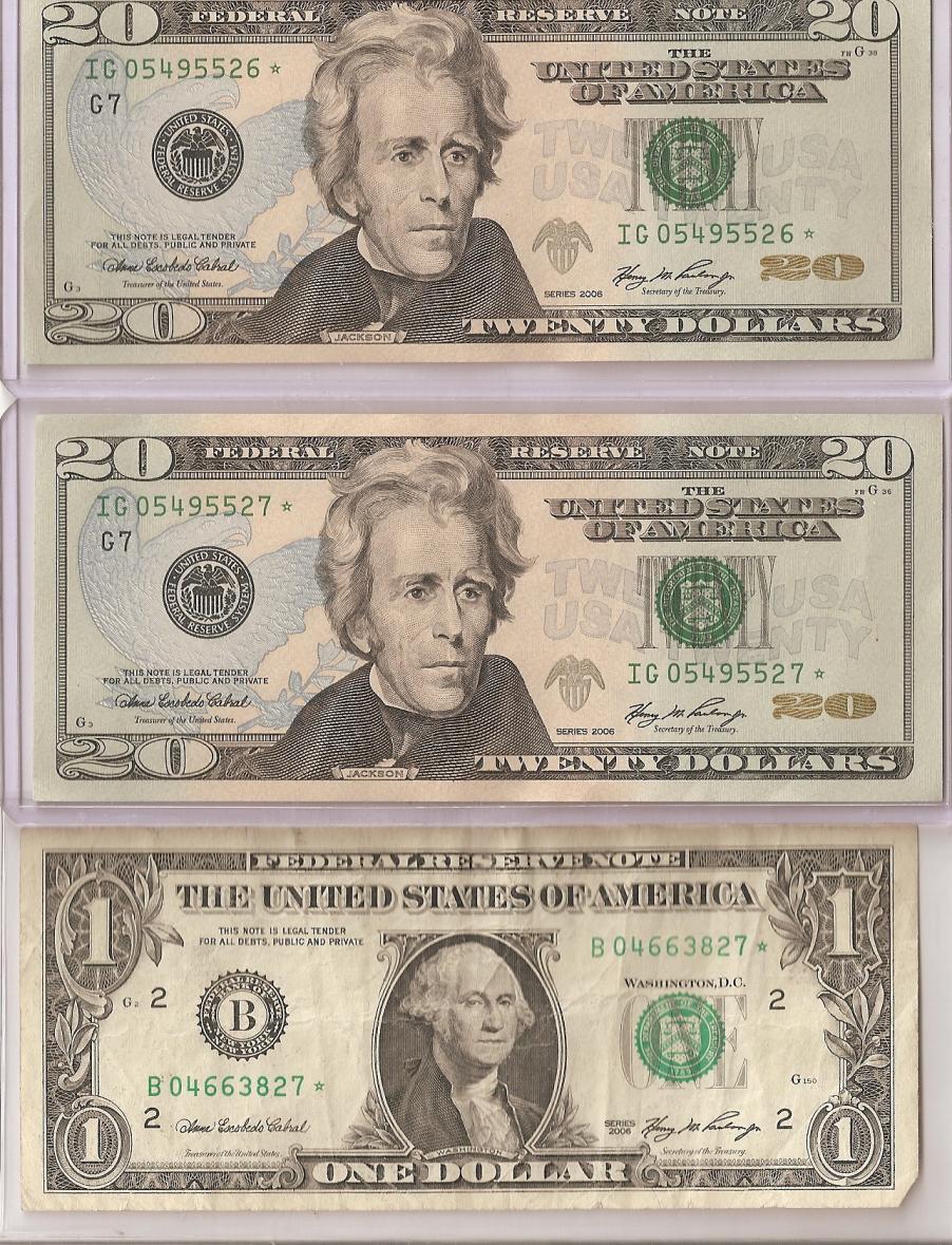 I know that somewhere there was a thread going on your newest notes. Since I couldn't find it, I thought I'd start a new one. These are three that I got from the bank today, two are series 2006 $20 *'s with consecutive serials. Post your newest one! :thumb: