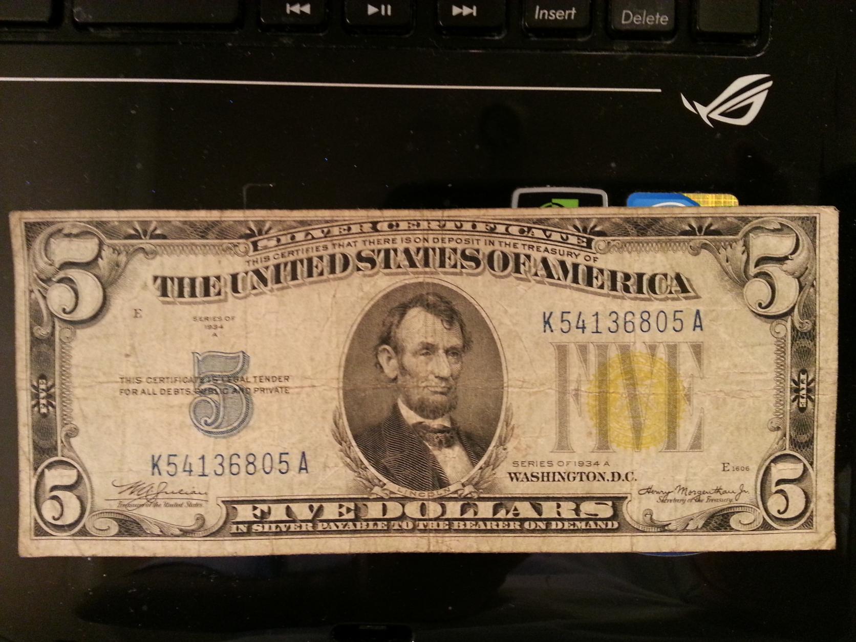 Well I ordered this note: But instead I got this: I didn't even gain anything despite the higher denomination. The $1 SC is XF+ to AU condition, and the $5 is in Fine condition. I'm trying to get the seller to send me the correct note.