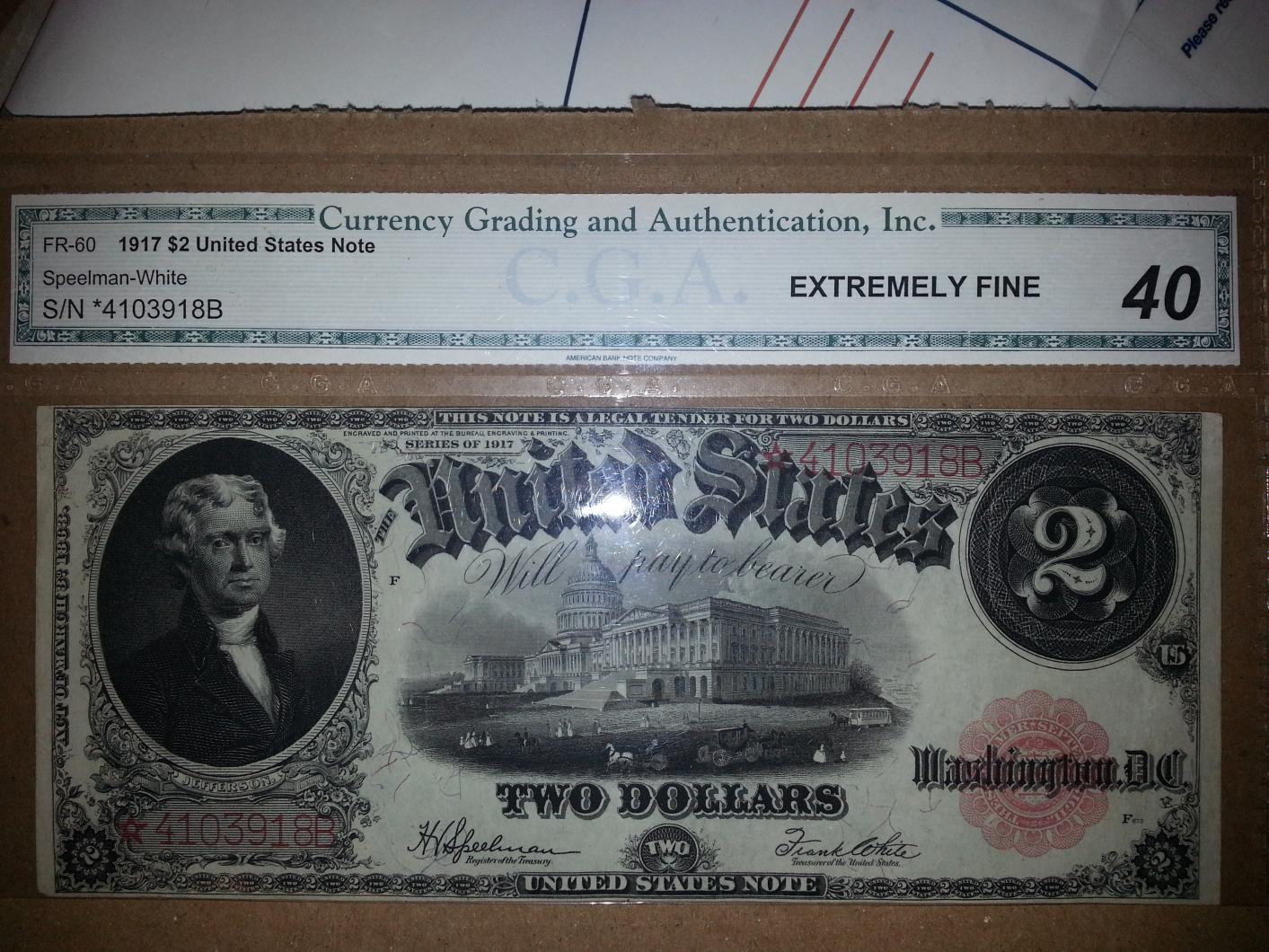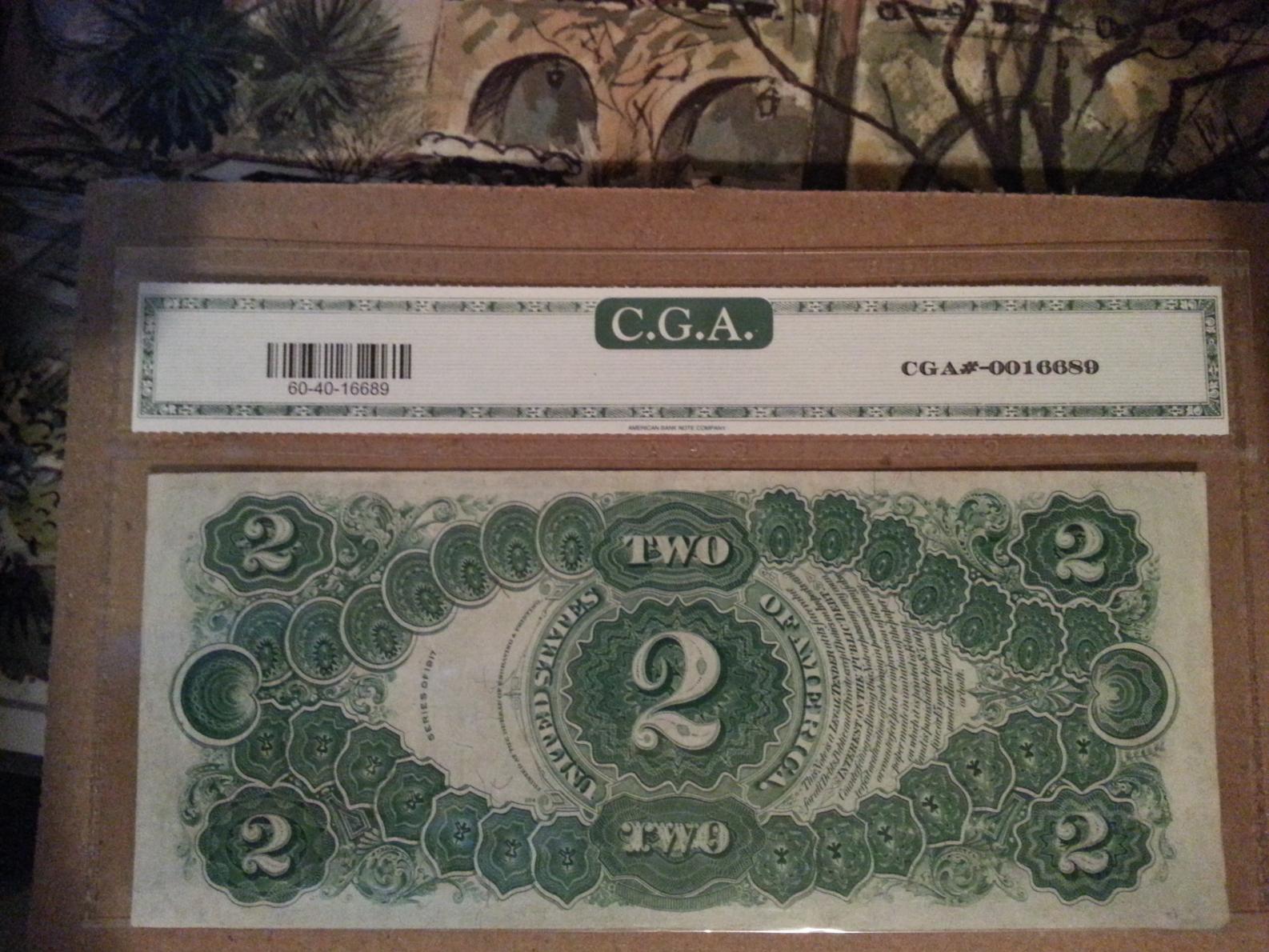 My first large size star note. Please excuse the photos. I haven't been able to get anywhere with decent lighting. From what I can tell this note should grade a 50. I can't believe I would ever say that the old CGA under-graded something. But here I am saying just that. I paid way under market for an XF 40 Fr. 60 star, let alone an AU 50. I'm going to really examine it closely before I cut it out to have it regraded.