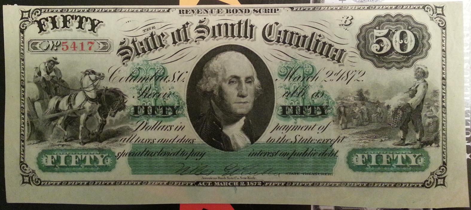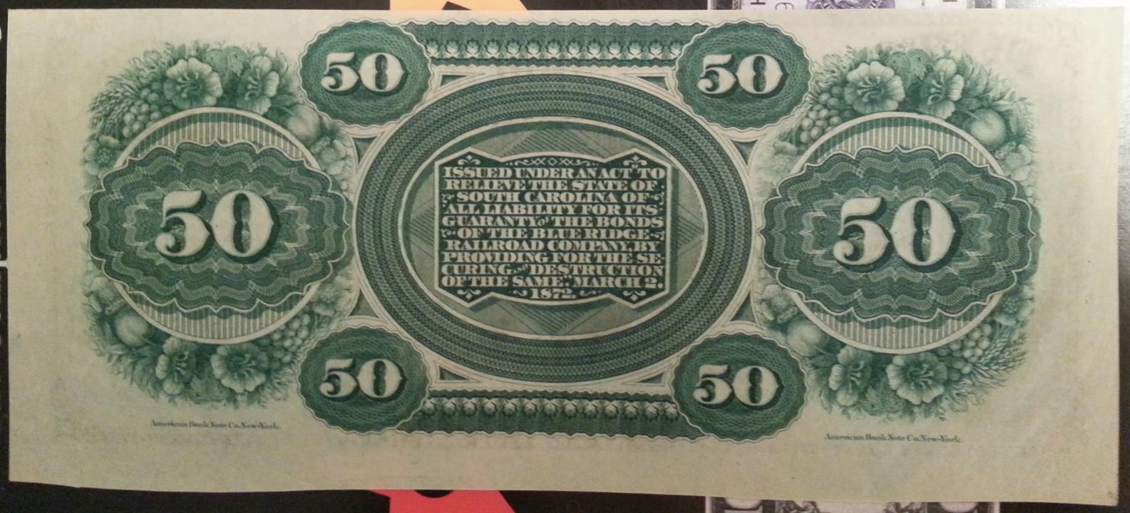 This bad boy finally arrived. 1872 $50 South Carolina Revenue Bond Scrip. This is my first obsolete note, and what a beauty it is. It has one light fold (no crease) in the corner. Lyn Knight called it AU. The margins on this note are absolutely horrific. Did they not know how to cut in straight lines in the 1870s? Whoever cut this note used scissors and had to be heavily intoxicated. It really reminds me of the 1878 $50 legal tender series with the fancy L's. Of course this South Carolina note is far more affordable.