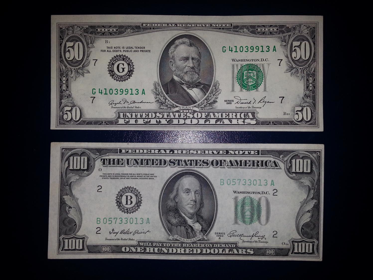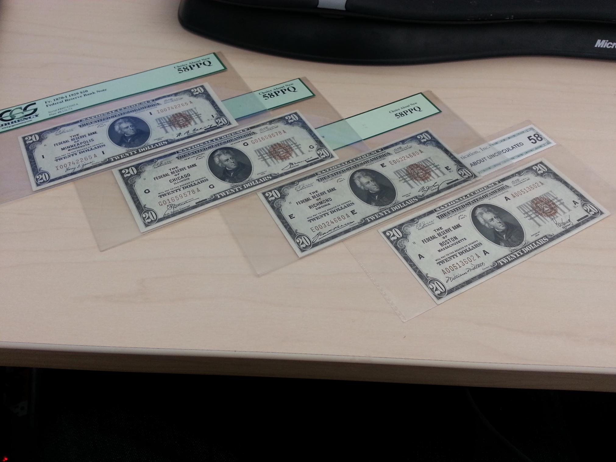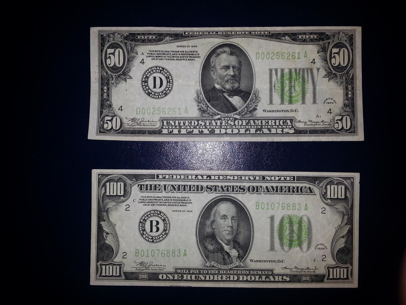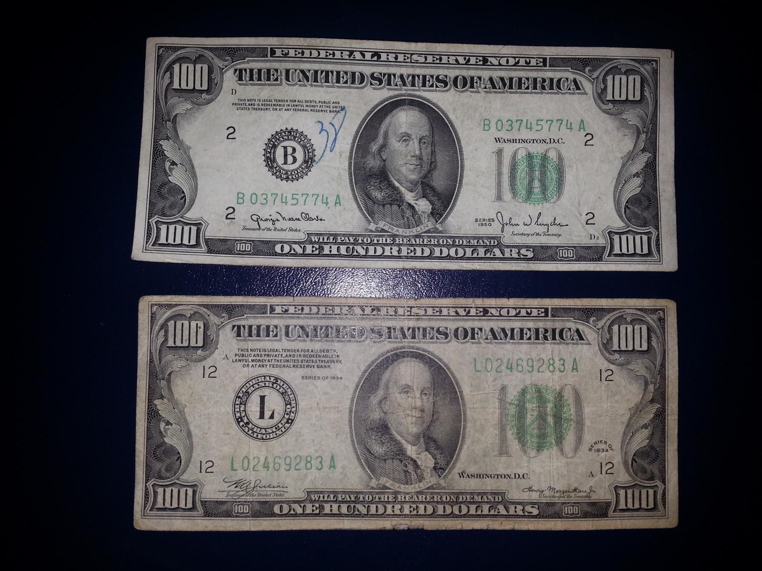 Got these from the bank at face value. Not a bad score: 1934 $50 FRN Cleveland Lime Green Seal (VF w/ Pin holes) 1934 $100 FRN New York Lime Green Seal (VF+) 1934 $100 FRN San Francisco Lime Green Seal (VG w/ Pin holes) 1950 $100 FRN New York (VF w/ writing) 1950A $100 FRN New York (VF) 1981 $50 FRN Chicago (AU) 1953C $2 US Note (Fine w/ missing corner) 2006 $20 FRN San Francisco (Repeater serial number IL 39693969 E)
